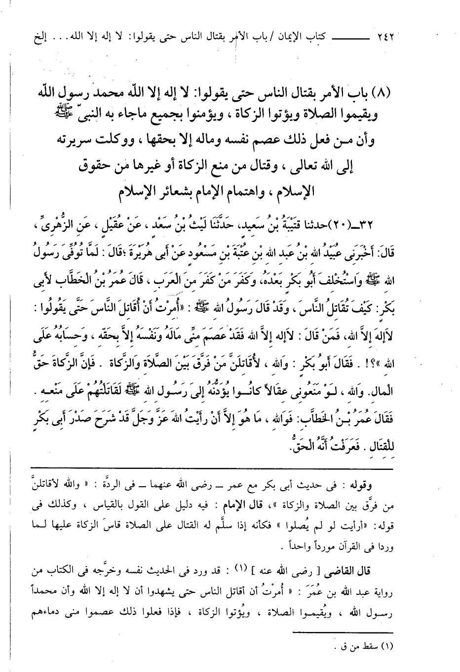 32 - (20) حدثنا قتَيْبَةُ بْنُ سَعِيدٍ، حَدَّثَنَا لَيْثُ بْنُ سَعْدٍ، عَنْ عُقَيْلٍ، عَنِ الزُّهْرِىِّ، قَالَ: أَخْبَرَنِى عُبَيْدُ اللهِ بْنُ عَبدِ اللهِ بْنِ عُتْبَةَ بْنِ مَسْعُودٍ عَنْ أَبِى هُرَيْرَةَ؛ قَالَ: لَمَّا تُوُفِّىَ رَسُولُ اللهِ صَلَّى اللهُ عَلَيْهِ وَسَلَّمَ وَاسْتُخْلِفَ أَبُو بَكْرٍ بَعْدَهُ، وَكَفَرَ مَنْ كَفَرَ مِنَ الْعَرَبِ، قَالَ عُمَرُ بْنُ الْخَطَّابِ لأَبِى بَكْرٍ: كَيْفَ تُقَاتِلُ النَّاسَ، وَقَدْ قَالَ رَسُولُ اللهِ صَلَّى اللهُ عَلَيْهِ وَسَلَّمَ: " أُمِرْتُ أَنْ أُقَاتِلَ النَّاسَ حَتَّى يَقُولُوا: لَا إلهَ إِلَّا اللهِ، فَمَنْ قَالَ: لَا إله إِلَّا الله فَقَدْ عَصَمَ مِنِّى مَالَهُ وَنَفْسَهُ إِلَّا بِحَقّهِ، وَحِسَابُهُ عَلَى اللهِ "؟!. فَقَالَ أَبُو بَكْرٍ: وَاللهِ، لأُقَاتِلَنَّ مَنْ فَرَّقَ بَيْنَ الصَّلَاةِ وَالزَّكاة. فَإنَّ الزَّكاةَ حَقُّ الْمالِ. وَاللهِ، لَوْ مَنَعُونِى عِقَالاً كَانُوا يُؤَدُّونَهُ إِلى رَسُول اللهِ صَلَّى اللهُ عَلَيْهِ وَسَلَّمَ لَقَاتَلْتُهُمْ عَلَى مَنْعِهِ. فَقَالَ عُمَرُ بْنُ الخَطَّابِ: فَوَاللهِ، مَا هُوَ إِلَّا أَنْ رأَيْتُ اللهَ عَزَّ وَجَلَّ قَدْ شَرَحَ صَدْرَ أَبِى بَكْرٍ لِلْقِتَالِ. فَعَرَفْتُ أَنَّهُ الْحَقُّ.