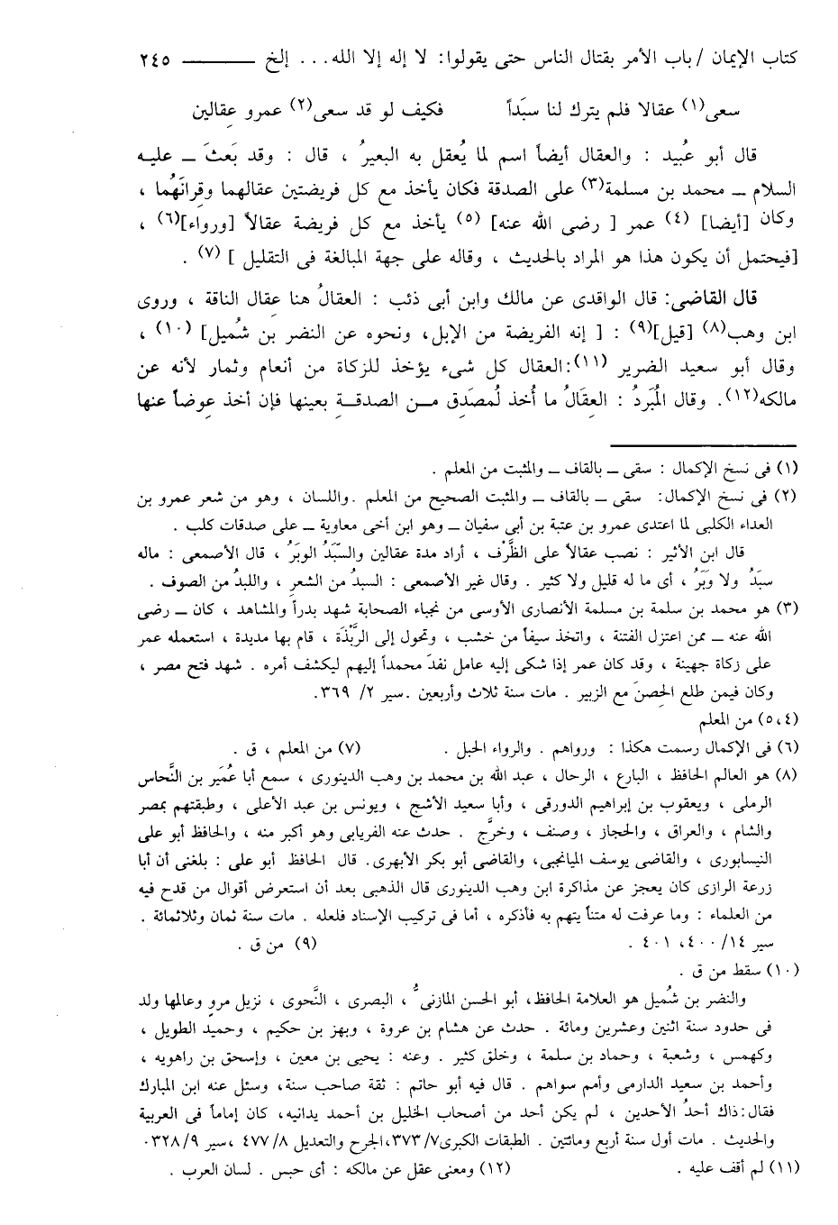 قال القاضى: قال الواقدى عن مالك وابن أبى ذئب: العقالُ هنا عِقال الناقة، وروى ابن وهب (¬8) [قيل] (¬9): [إنه الفريضة من الإبل، ونحوه عن النضر بن شُميل] (¬10)، وقال أبو سعيد الضرير (¬11): العقال كل شىء يؤخذ للزكاة من أنعام وثمار لأنه عن مالكه (¬12). وقال المُبَردُ: العِقَالُ ما أُخذ لمُصَدِق من الصدقةِ بعينها فإن أخذ عِوضاً عنها