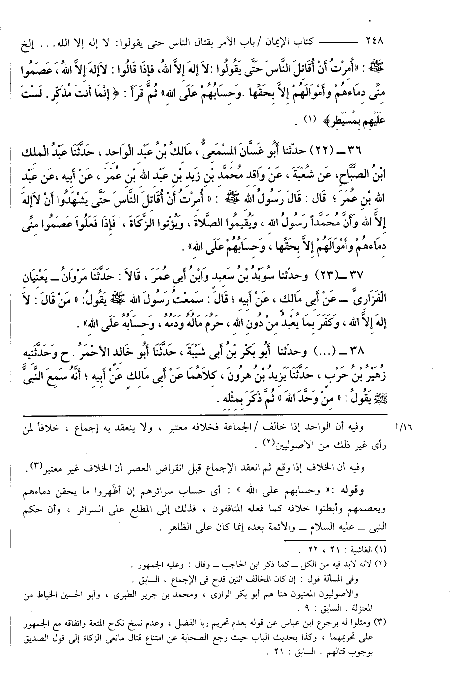 36 - (22) حدّثنا أَبُو غَسَّانَ المِسْمَعِىُّ، مَالِكُ بْنُ عَبْدِ الْوَاحِدِ، حَدَّثَنَا عَبْدُ الْمَلِك ابْنُ الصَّبَّاحِ، عَن شُعْبَةَ، عَنْ وَاقِدِ [[بن]] مُحَمَّدِ بْنِ زَيدِ بْنِ عَبْدِ اللهِ بْنِ عُمَرَ، عَنْ أَبِيهِ، عَن عَبْدِ اللهِ بْنِ عُمَرَ؛ قَال: قَالَ رَسُولُ اللهِ صَلَّى اللهُ عَلَيْهِ وَسَلَّمَ: " أُمِرْتُ أَنْ أُقَاتِلَ النَّاسَ حَتَّى يَشْهَدُوا ان لَا إلهَ إِلاًّ الله وَأَنَّ مُحَمَّداً رَسُولُ اللهِ، وَيُقيمُوا الصَّلاةَ، وَيُؤْتوا الزَّكَاةَ، فَإِذَا فَعَلُوا عَصَمُوا مِنِّى دِمَاءهُمْ وأَمْوَالَهُمْ إِلَّا بِحَقِّها، وَحِسَابُهُمْ عَلَى اللهِ ".