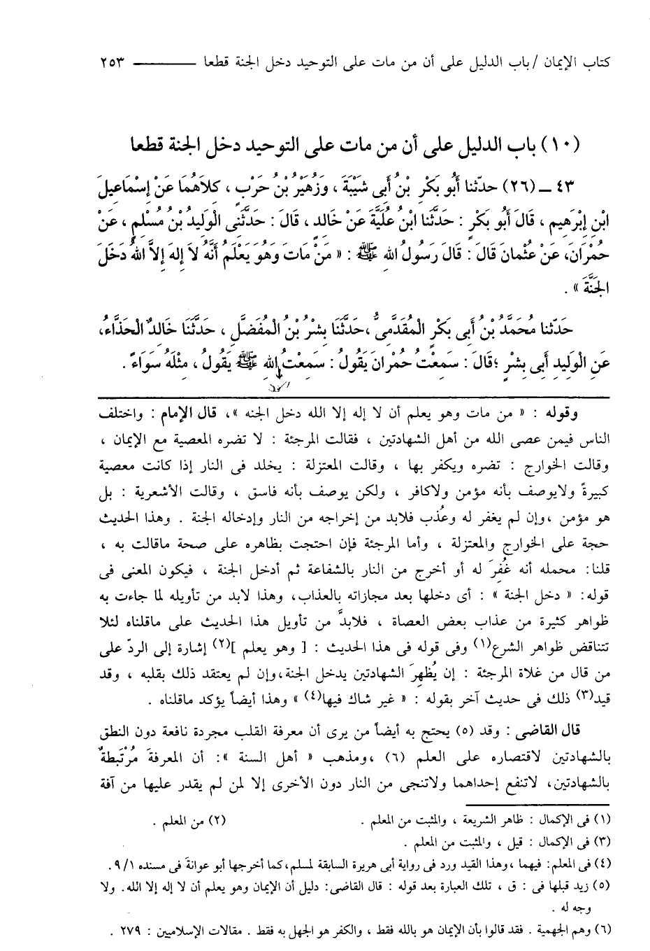 43 - (26) حدّثنا أَبُو بَكْرِ بْنُ أَبِى شَيْبَةَ، وَزُهَيْرُ بْنُ حَرْبٍ، كِلَاهُمَا عَنْ إِسْمَاعِيلَ ابْنِ إِبْرَاهِيم، قَالَ أَبُو بَكْرٍ: حَدَّثَنَا ابْنُ عُلَيَّةَ عَنْ خَالِدٍ، قَالَ: حَدَّثَنِى الْوَلِيدُ بْنُ مُسْلِمٍ، عَنْ حُمْرَانَ، عَنْ عُثْمانَ قَالَ: قَالَ رَسُولُ اللهِ صَلَّى اللهُ عَلَيْهِ وَسَلَّمَ: " مَنْ مَاتَ وَهُوَ يَعْلَمُ أَنَّهُ لَا إِلهَ إِلَّا اللهُ دَخَلَ الجَنَّةَ ".