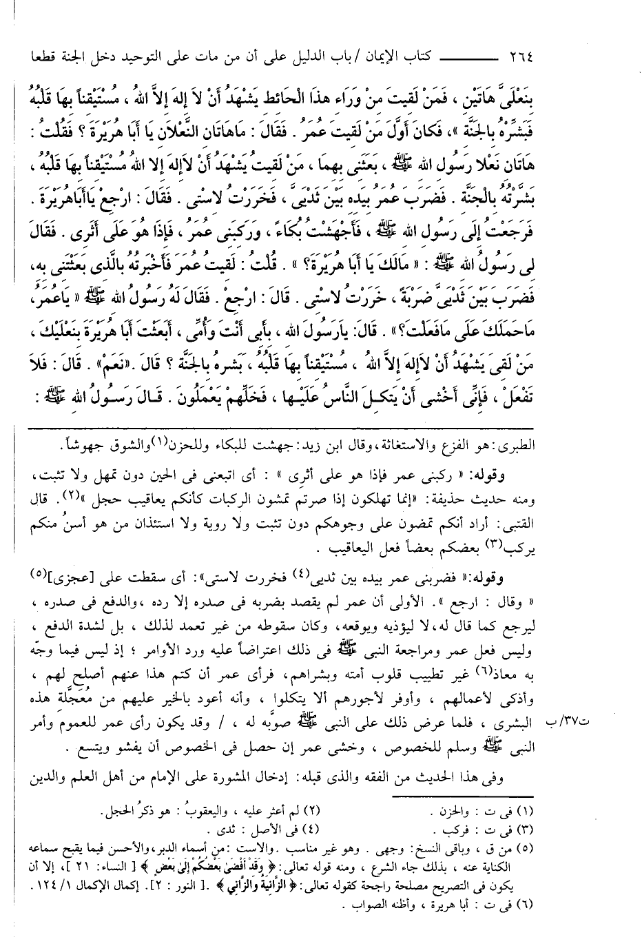 بِنَعْلَى هَاتَيْنِ، فَمَنْ لَقِيتَ مِنْ وَرَاءِ هذَا الْحَائِطِ يَشْهَدُ أَنْ لَا إِلهَ إِلَّا اللهُ، مُسْتَيْقِناً بِهَا قَلْبُهُ فَبَشِّرْهُ بِالجَنَّةِ "، فَكانَ أَوَّلَ مَنْ لَقِيتَ عُمَرُ. فَقَالَ: مَا هَاتَانِ النَّعْلَانِ يَا أَبَا هُرَيْرَةَ؟ فَقُلْتُ: هَاتَانِ نَعْلا رَسُولِ اللهِ صَلَّى اللهُ عَلَيْهِ وَسَلَّمَ، بَعَثَنِى بِهِمَا، مَنْ لَقِيتُ يَشْهَدُ أَنْ لَا إِلهَ إِلا اللهُ مُسْتَيْقِناً بِهَا قَلْبُهُ، بَشَّرْتُهُ بِالْجَنَّةِ. فَضَرَبَ عُمَرُ بِيَدِهِ بَيْنَ ثَدْيَىَّ، فَخَرَرْتُ لاِسْتى. فَقَالَ: ارْجِعْ يَا أَبَاهُرَيْرَةَ. فَرَجَعْتُ إِلَى رَسُولِ اللهِ صَلَّى اللهُ عَلَيْهِ وَسَلَّمَ، فَأَجْهَشْتُ بُكَاءً، وَرَكِبَنِى عُمَرُ، فَإِذَا هُوَ عَلَى أَثَرِى. فَقَالَ لِى رَسُولُ اللهِ صَلَّى اللهُ عَلَيْهِ وَسَلَّمَ: " مَا لَكَ يَا أَبَا هُرَيْرَةَ؟ ". قُلْتُ: لَقِيتُ عُمَرَ فَأَخْبَرتُهُ بالَّذِى بَعَثْتَنِى بِهِ، فَضَرَبَ بَيْنَ ثَدْيَىَّ ضَرْبَةً، خَرَرْتُ لاسْتِى. قَالَ: ارْجِعْ. فَقَالَ لَهُ رَسُولُ اللهِ صَلَّى اللهُ عَلَيْهِ وَسَلَّمَ " يَا عُمَرُ، مَا حَمَلَكَ عَلَى مَا فَعَلْتَ؟ ". قَالَ: يَا رَسُولَ اللهِ، بِأَبِى أَنْتَ وَأُمِّى، أَبَعَثْتَ أَبَا هُرَيْرَةَ بِنَعْلَيْكَ، مَنْ لَقِىَ يَشْهَدُ أَنْ لَا إِلهَ إِلَّا اللهُ، مُسْتَيْقِناً بِهَا قَلْبُهُ، بَشرهُ بِالجَنَّةِ؟ قَالَ. " نَعَمْ ". قَالَ: فَلَا تَفْعَلْ، فَإِنِّى أَخْشى أَنْ يَتكِلَ النَّاسُ عَلَيْهَا، فَخَلِّهمْ يَعمَلُونَ. قَالَ رَسُولُ اللهِ صَلَّى اللهُ عَلَيْهِ وَسَلَّمَ: