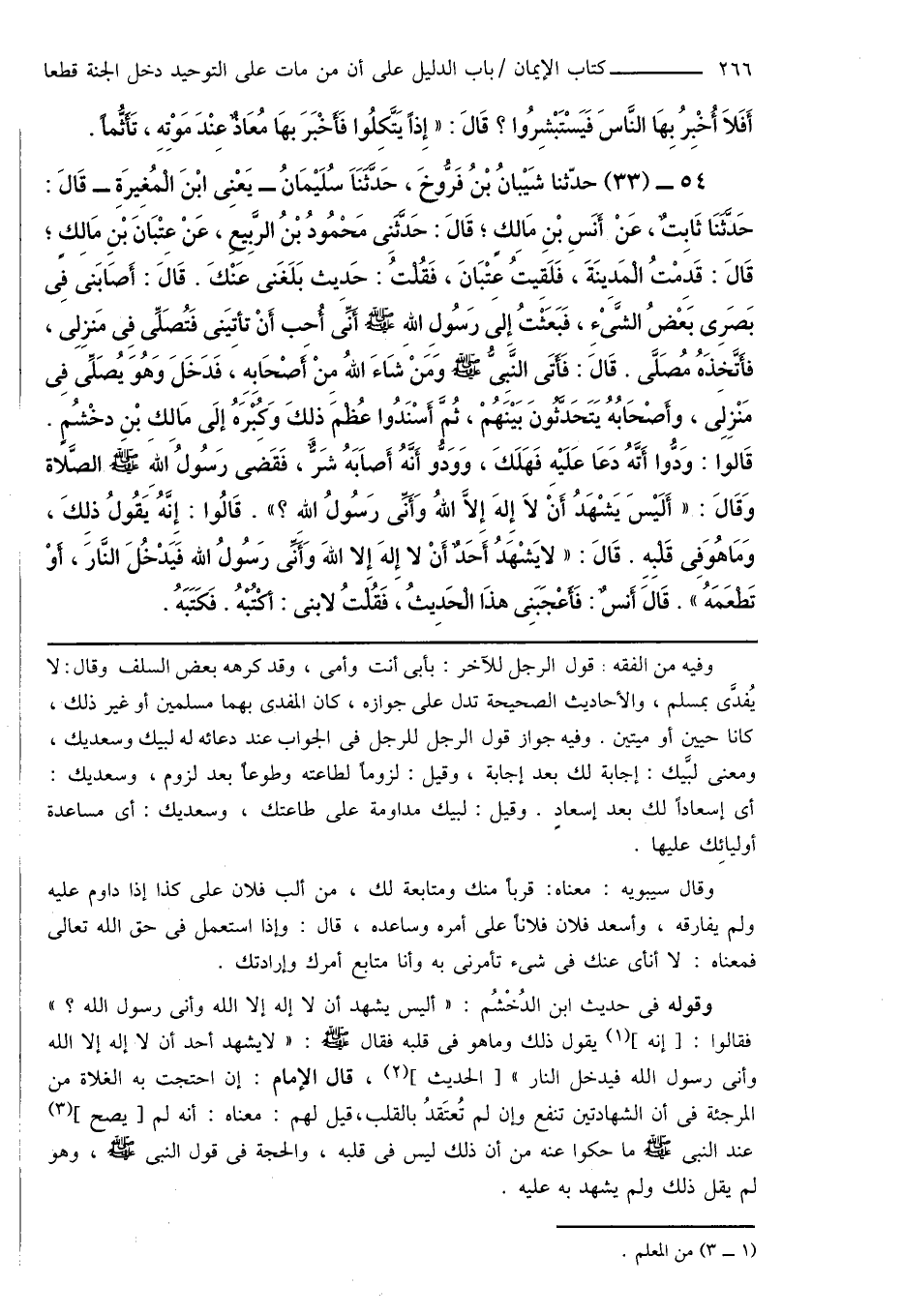 54 - (33) حدّثنا شَيْبانُ بْنُ فَرُّوخَ، حَدَّثَنَا سُلَيْمَانُ - يَعْنِى ابْنَ الْمُغِيرَةِ - قَالَ: حَدَّثَنَا ثَابِتٌ، عَنْ أَنَسِ بْنِ مَالِكٍ؛ قَالَ: حَدَّثَنِى مَحْمُودُ بْنُ الرَّبِيعِ، عَنْ عِتْبَانَ بْنِ مَالِكٍ؛ قَالَ: قَدِمْتُ الْمَدِينَةَ، فَلَقِيتُ عِتْبَانَ، فَقُلْتُ: حَدِيث بَلَغَنى عَنْكَ. قَالَ: أَصَابَنى فِى بَصَرِى بَعْضُ الشَّىْءِ، فَبَعَثْتُ إِلى رَسُولِ اللهِ صَلَّى اللهُ عَلَيْهِ وَسَلَّمَ أَنِّى أُحِب أَنْ تأتِيَنى فَتُصَلِّى فِى مَنزِلِى، فأَتَّخِذَهُ مُصَلَّى. قَالَ: فَأَتَى النَّبِىُّ صَلَّى اللهُ عَلَيْهِ وَسَلَّمَ وَمَنْ شَاءَ اللهُ منْ أَصْحَابِهِ، فَدَخَلَ وَهُوَ يُصَلِّى فِى مَنْزِلِى، وأَصْحَابُهُ يَتَحَدَّثُونَ بَيْنَهُمْ، ثُمَّ أَسْنَدُوا عُظْمَ ذلِكَ وَكُبْرَهُ إلَى مَالِكِ بْنِ دخْشُمٍ. قَالوا: وَدُّوا أَنَّهُ دَعَا عَلَيْهِ فَهَلَكَ، وَوَدُّو أَنَّهُ أَصَابَهُ شَرٌّ، فَقَضى رَسُولُ اللهِ صَلَّى اللهُ عَلَيْهِ وَسَلَّمَ الصَّلاة وَقَالَ: " أَلَيْسَ يَشْهَدُ أَنْ لَا إِلهَ إِلَّا اللهُ وَأَنِّى رَسُولُ الله؟ ". قَالُوا: إِنَّهُ يَقُولُ ذلِكَ، وَمَا هُوَ فِى قَلْبِهِ. قَالَ: " لا يَشْهَدُ أَحَدٌ أَنْ لا إِلهَ إِلا اللهَ وَأَنِّى رَسُولُ الله فَيَدْخُلَ النَّارَ، أَوْ تَطْعَمَهُ ". قَالَ أَنسٌ: فَأَعْجَبَنِى هذَا الْحَدِيثُ، فَقُلْتُ لابنى: أكْتُبْهُ. فَكَتَبَهُ.