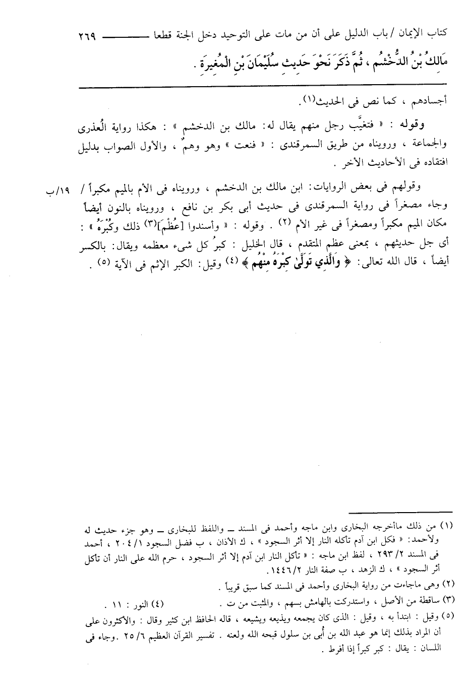 وقولهم فى بعض الروايات: ابن مالك بن الدخشم، ورويناه فى الأم بالميم مكبراً وجاء مصغراً فى رواية السمرقندى فى حديث أبى بكر بن نافع، ورويناه بالنون أيضاً مكان الميم مكبراً ومصغراً فى غير الأم (¬2). وقوله: " وأسندوا [عُظْمَ] (¬3) ذلك وكُبْرَهُ ": أى جل حديثهم، بمعنى عظم المتقدم، قال الخليل: كبرُ كل شىء معظمه ويقال: بالكسر أيضاً، قال الله تعالى: {وَالَّذِي تَوَلَّى كِبْرَهُ مِنْهُم} (¬4) وقيل: الكبر الإثم فى الآية (¬5).