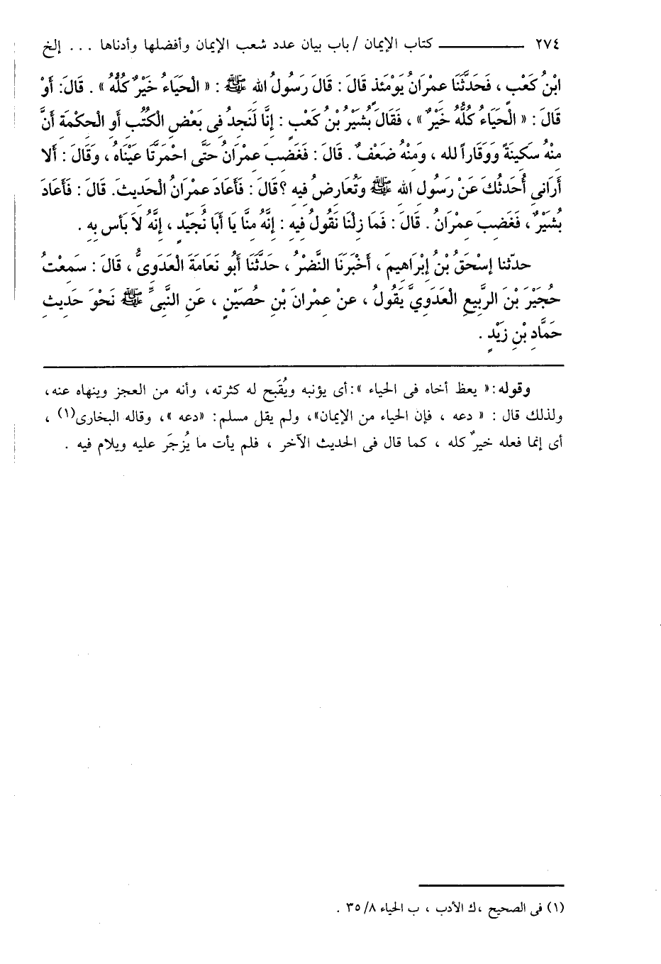 ابْنُ كَعْبٍ، فَحَدَّثَنَا عِمْرَانُ يَوْمَئذٍ قَالَ: قَالَ رَسُولُ اللهِ صَلَّى اللهُ عَلَيْهِ وَسَلَّمَ: " الْحَيَاءُ خَيْرٌ كُلُّهُ ". قَالَ: أَوْ قَالَ: " الْحَيَاءُ كُلُّهُ خَيْرٌ "، فَقَالَ بُشَيْرُ بْنُ كَعْبٍ: إِنَّا لَنَجِدُ فِى بَعْضِ الْكُتُبِ أَوِ الْحِكْمَةِ أَنَّ مِنْهُ سَكِينَةً وَوَقَاراً لله، وَمِنْهُ ضَعْفٌ. قَالَ: فَغَضِبَ عِمْرَانُ حَتَّى احْمَرَّتَا عَيْنَاهُ، وَقَالَ: أَلا أَرَانِى أُحَدثُكَ عَنْ رَسُولِ اللهِ صَلَّى اللهُ عَلَيْهِ وَسَلَّمَ وَتُعَارِضُ فِيهِ؟ قَالَ: فَأَعَادَ عِمْرَانُ الْحَدِيثَ. قَالَ: فَأَعَادَ بُشَيْرٌ، فَغَضِبَ عِمْرَانُ. قَالَ: فَمَا زِلْنَا نَقُولُ فِيهِ: إِنَّهُ مِنَّا يَا أَبَا نُجَيْدٍ، إِنَّهُ لَا بَأس بِهِ.