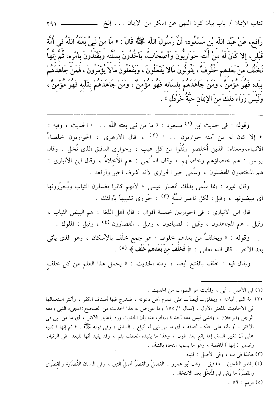 رَافِع، عَنْ عَبْدِ اللهِ بْنِ مَسْعُود؛ أَنَّ رَسُولَ اللهِ صَلَّى اللهُ عَلَيْهِ وَسَلَّمَ قَالَ: " مَا مِنْ نَبِىِّ بَعَثَهُ اللهُ فِى أُمَّةٍ قَبْلِى، إِلا كَانَ لَهُ مِنْ أُمَّتِهِ حَوَارِيُّونَ وَأَصْحَابٌ، يَأخُذُونَ بِسُنَّتِهِ ويَقْتَدُونَ بِأمْرِهِ، ثُمَّ إِنَّها تَخْلُفُ مِنْ بَعْدِهِم خُلُوفٌ، يَقُولُونَ مَا لا يَفْعَلُونَ، وَيَفْعَلُونَ مَا لا يُؤْمَرُونَ، فَمَنْ جَاهَدَهُمْ بِيَدِهِ فَهُوَ مُؤْمِنٌ، وَمَنْ جَاهَدَهُمْ بِلِسَانِهِ فَهُوَ مُؤْمِنٌ، وَمَنْ جَاهَدَهُمْ بِقَلْبِهِ فَهُوَ مُؤْمِنٌ، وَلَيْسَ وَرَاءَ ذلِكَ مِنَ الإيمَانِ حَبَّةُ خَرْدَلٍ ".