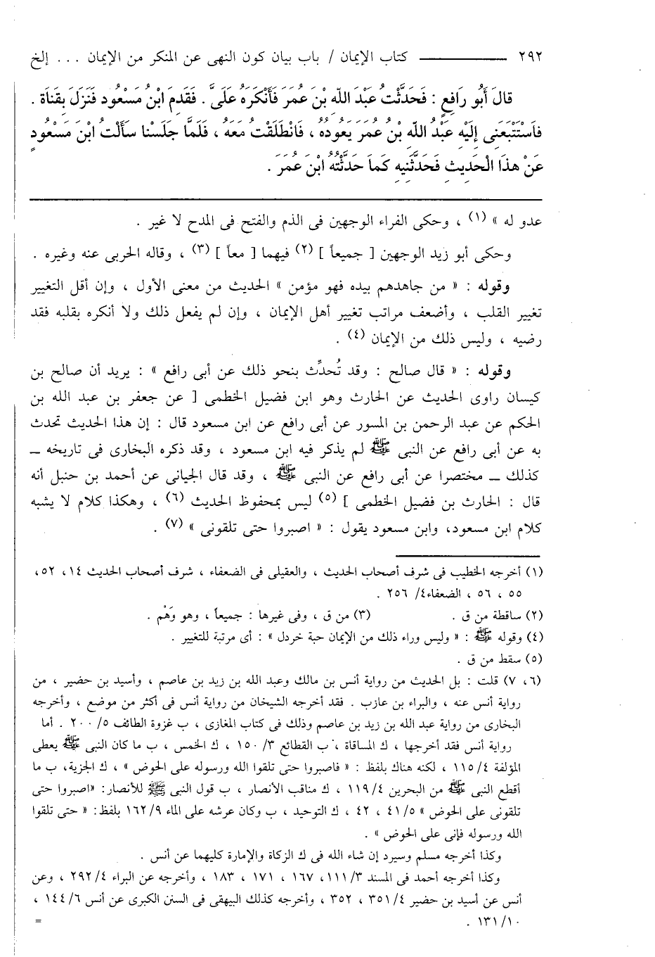 (¬6) و (¬7) قلت: بل الحديث من رواية أنس بن مالك وعبد الله بن زيد بن عاصم، وأسيد بن حضير، من رواية أنس عنه، والبراء بن عازب. فقد أخرجه الشيخان من رواية أنس فى أكثر من موضع، وأخرجه البخارى من رواية عبد الله بن زيد بن عاصم وذلك فى كتاب المغازى، ب غزوة الطائف 5/ 200. أما رواية أنس فقد أخرجها، ك المساقاة، ب القطائع 3/ 150، ك الخمس، ب ما كان النبى صَلَّى اللهُ عَلَيْهِ وَسَلَّمَ يعطى المؤلفة 4/ 115، لكنه هناك بلفظ: " فاصبروا حتى تلقوا الله ورسوله على الحوض "، ك الجزية، ب ما أقطع النبى صَلَّى اللهُ عَلَيْهِ وَسَلَّمَ من البحرين 4/ 119، ك مناقب الأنصار، ب قول النبى صَلَّى اللهُ عَلَيْهِ وَسَلَّمَ للأنصار: " اصبروا حتى تلقونى على الحوض " 5/ 41، 42، ك التوحيد، ب وكان عرشه على الماء 9/ 162 بلفظ: " حتى تلقوا الله ورسوله فإنى على الحوض ".