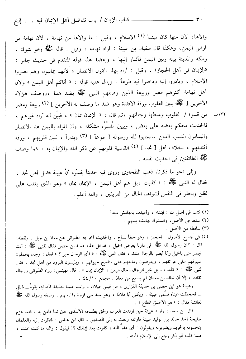 وإلى نحو ما ذكرناه ذهب الطحاوى وروى فيه حديثاً يفسرّه أنَّ عيينة فضل أهل نجد، فقال له النبى صَلَّى اللهُ عَلَيْهِ وَسَلَّمَ: " كذبت، بل هم أهل اليمن، الإيمان يمان " وهو الذى يغلب على الظن ويحلو فى النفس لشواهد الحال من الفريقين، والله أعلم.