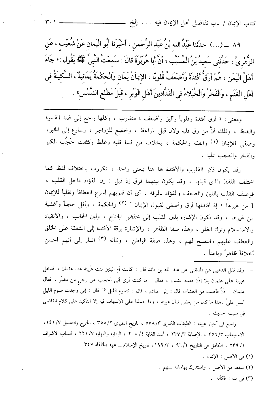 89 - (...) حدّثنا عَبْدُ اللهِ بْنُ عَبْدِ الرَّحْمنِ، أَخْبَرَنا أَبُو الْيَمَانِ عَنْ شُعَيْبٍ، عَنِ الزُّهْرِىِّ، حَدَّثَنِى سَعِيدُ بْنُ الْمُسَيَّب؛ أَنَّ أَبا هُرَيْرَةَ قالَ: سَمِعْتُ النَّبِىَّ صَلَّى اللهُ عَلَيْهِ وَسَلَّمَ يَقُول: " جَاءَ أَهْلُ الْيَمَن، هُمْ أَرَقُّ أَفْئِدَةً وَأَضْعَفُ قُلوبًا، الإِيمَانُ يَمَانٍ وَالْحِكْمَةُ يَمَانِيةٌ، السَّكِينَةُ فِى أَهْلِ الْغَنَمِ، وَالْفَخْرُ وَالْخُيَلاءُ فِى الْفَدَّادِينَ أَهْلِ الْوَبَرِ، قِبَلَ مَطْلِع الشَّمْسِ ".