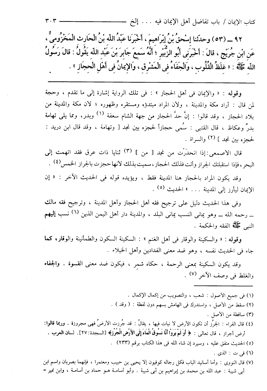 92 - (53) وحدّثنا إِسْحَاقُ بْنُ إِبْرَاهِيمَ، أَخْبَرَنَا عَبْدُ اللهِ بْنُ الْحَارِثِ الْمَخْزُومِىُّ، عَنِ ابْنِ جُرَيْجٍ، قالَ: أَخْبَرَنِى أَبُو الزُّبَيْرِ؛ أَنَّهُ سَمِعَ جَابِرَ بْنَ عَبْدِ اللهِ يَقُولُ: قالَ رَسُولُ اللهِ صَلَّى اللهُ عَلَيْهِ وَسَلَّمَ: " غِلَظُ الْقُلُوبِ، وَالْجَفَاءُ فِى الْمَشْرِقِ، وَالإِيمانُ فِى أَهْلِ الْحِجَازِ ".