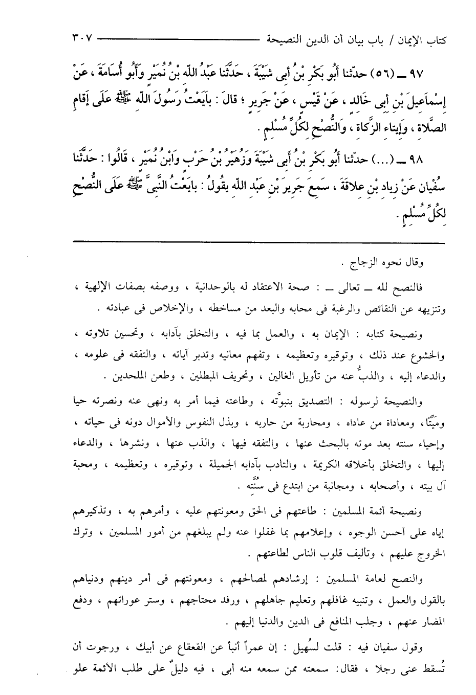 98 - (...) حدّثنا أَبُو بَكْرِ بْنُ أَبِى شَيْبَةَ وَزُهَيْرُ بْنُ حَرْبٍ وَابْنُ نُمَيْرٍ، قَالُوا: حَدَّثَنَا سُفْيان عَنْ زِيادِ بْنِ عِلاقَةَ، سَمِعَ جَرِيرَ بْنِ عَبْدِ اللهِ يقُولُ: بايَعْتُ النَّبِىَّ صَلَّى اللهُ عَلَيْهِ وَسَلَّمَ عَلَى النُّصْحِ لِكُلِّ مُسْلِمٍ.
