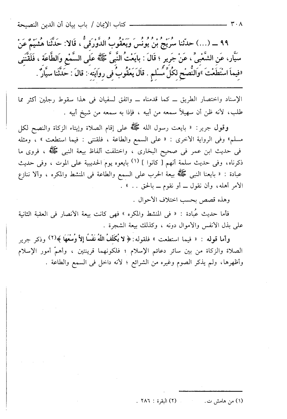 99 - (...) حدّثنا سُرَيْجُ بْنُ يُونُسَ وَيَعْقُوبُ الدَّوْرَقِىُّ، قَالا: حَدَّثَنَا هُشَيْمٌ عَنْ سَيَّار، عَنِ الشَّعْبِىِّ، عَنْ جَرِيرٍ؛ قَالَ: بايَعْتُ النَّبِىَّ صَلَّى اللهُ عَلَيْهِ وَسَلَّمَ عَلِى السَّمْعِ وَالطَّاعَةِ، فَلَقَّنَنِى " فِيمَا اسْتَطَعْتَ " وَالنُّصْحِ لِكُلِّ مُسْلِمٍ. قَالَ يَعْقُوبُ فِى رِوَايَتِهِ: قالَ: حَدَّثَنَا سيَّارٌ.