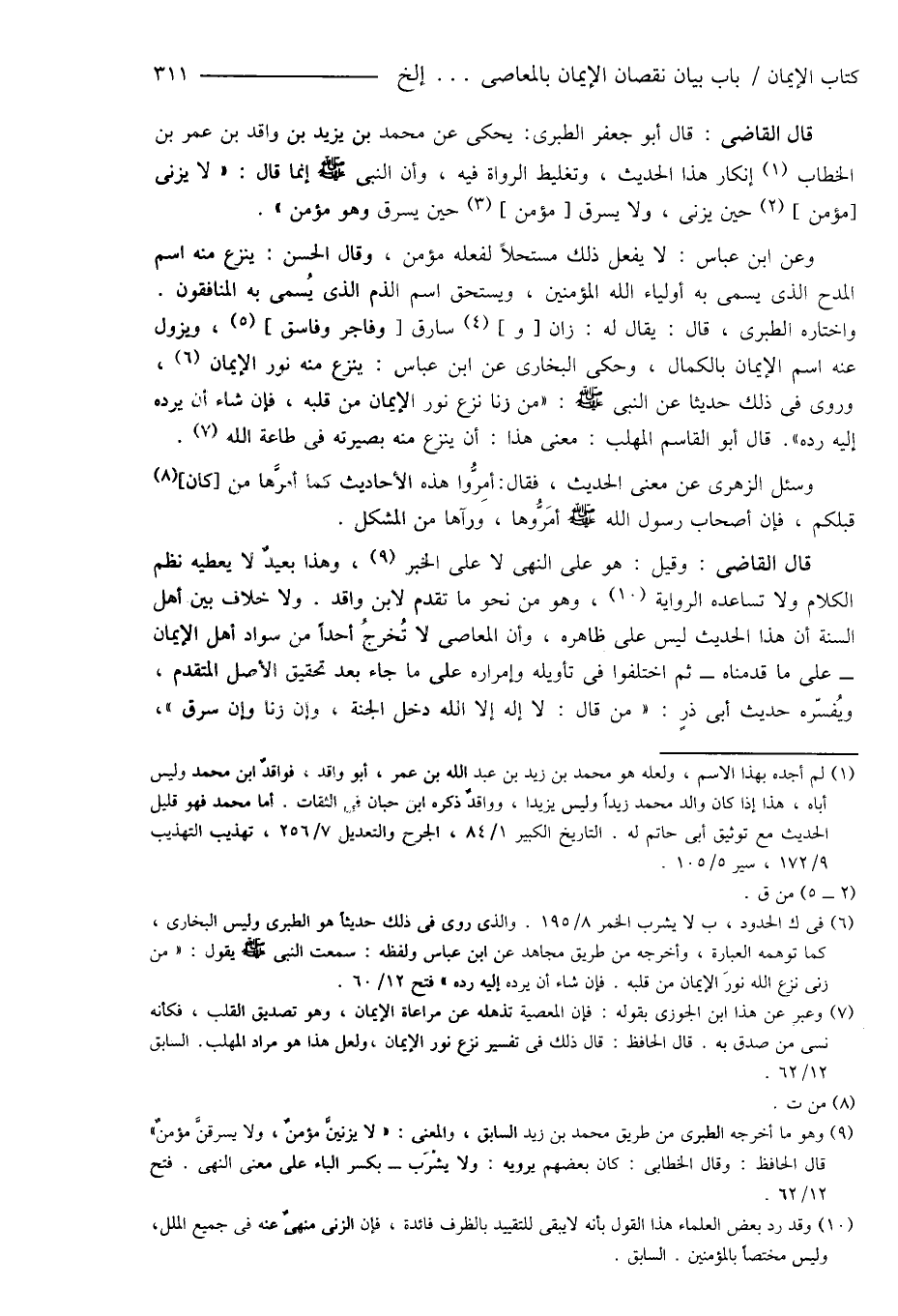قال القاضى: قال أبو جعفر الطبرى: يحكى عن محمد بن يزيد بن واقد بن عمر بن الخطاب (¬1) إنكار هذا الحديث، وتغليط الرواة فيه، وأن النبى صَلَّى اللهُ عَلَيْهِ وَسَلَّمَ إنما قال: " لا يزنى [مؤمن] (¬2) حين يزنى، ولا يسرق [مؤمن] (¬3) حين يسرق وهو مؤمن ".