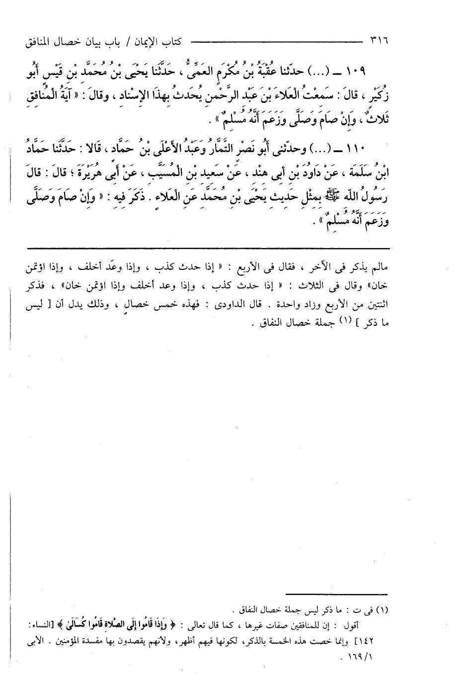 109 - (...) حدّثنا عُقْبَةُ بْنُ مُكْرَمٍ العَمِّىُّ، حَدَّثَنَا يَحْيَى بْنُ مُحَمَّدِ بْنِ قَيْسٍ أَبُو زُكيْرٍ، قالَ: سَمِعْتُ الْعَلاءَ بْنَ عَبْدِ الرَّحْمنِ يُحَدثُ بِهذَا الإِسْنادِ، وقالَ. " آيَةُ الْمُنافِقِ ثَلاثٌ، وَإِنْ صَامَ وَصَلَّى وَزَعَمَ أَنَّهُ مُسْلِمٌ ".