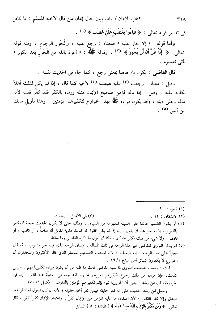 قلت: وسبب تضعيف النووى لما نسبه القاضى لمالك ما ظنه من أن يكون مراده تكفيرنا لهم، وليس كذلك، فإن مراده من ذلك رجوع تكفيرهم لغيرهم عليهم فقد جاء فى العتبيَّة عنه قال: أراه فى الحرورية، قال ابن رشد: يعنى أن الحرورية تبوء بإثم تكفيرهم المؤمنين بالذنوب. مكمل 1/ 170.