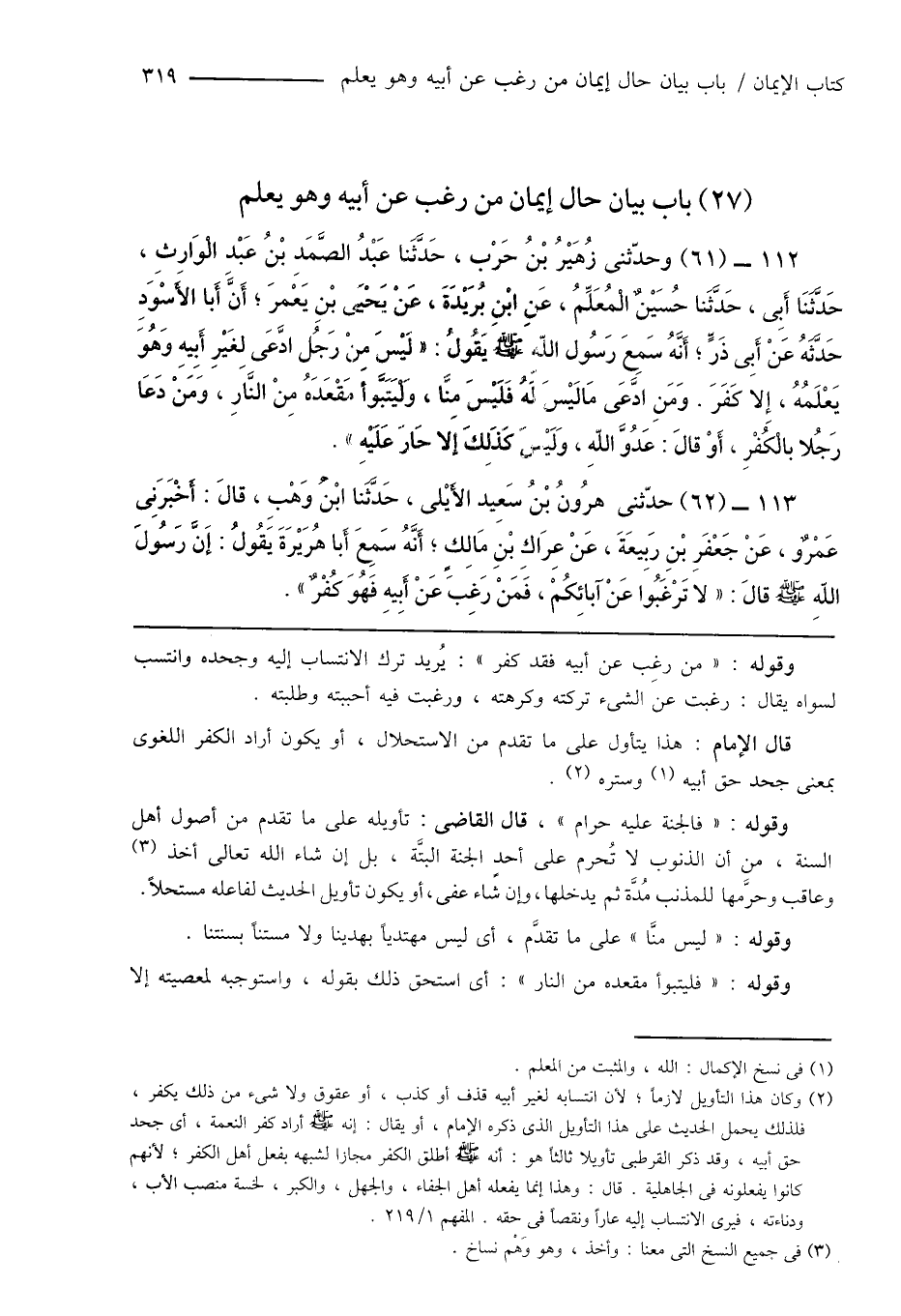 (27) باب بيان حال إيمان من رغب عن أبيه وهو يعلم