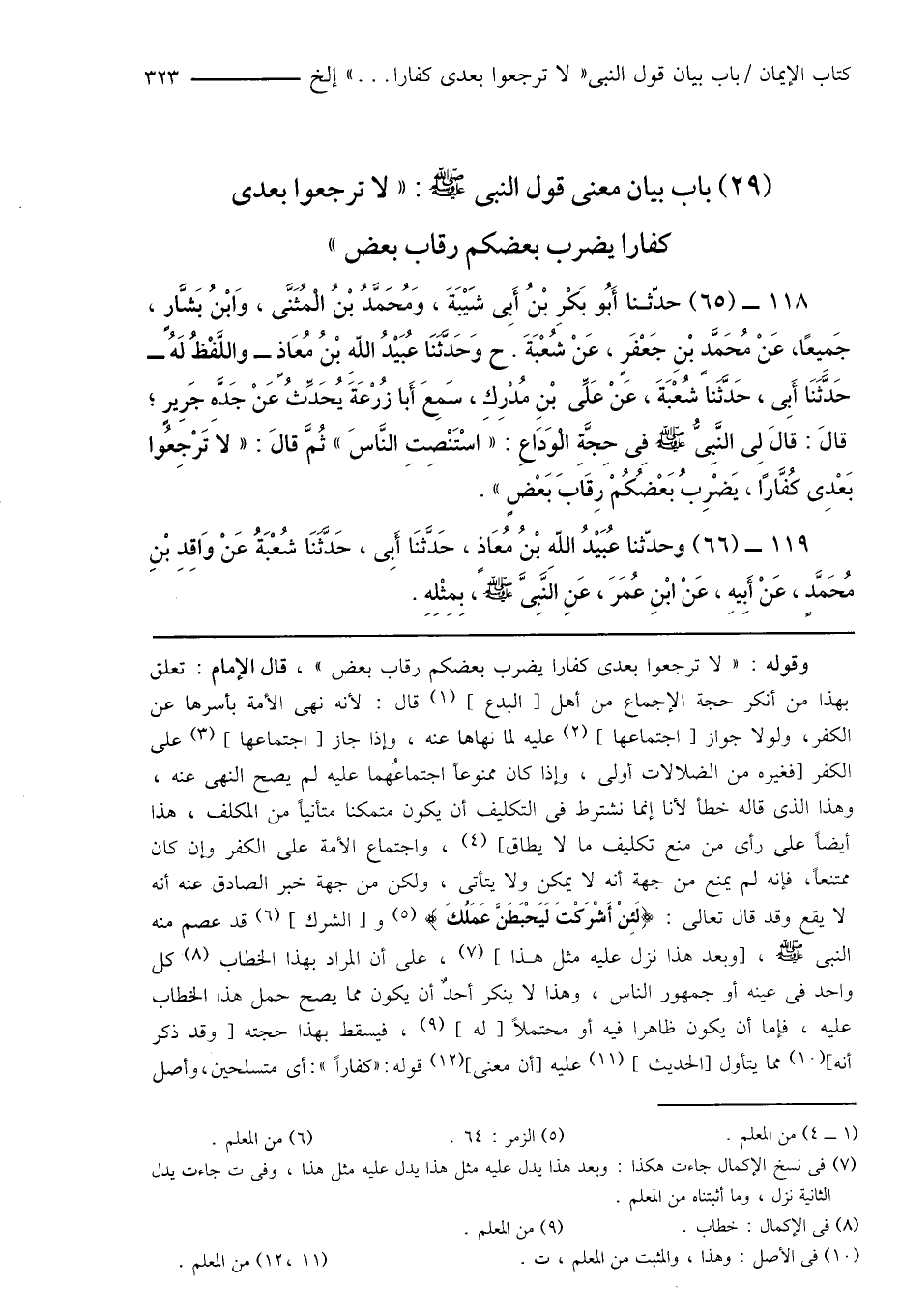 (29) باب بيان معنى قول النبى صَلَّى اللهُ عَلَيْهِ وَسَلَّمَ: " لا ترجعوا بعدى كفاراً يضرب بعضكم رقاب بعض "