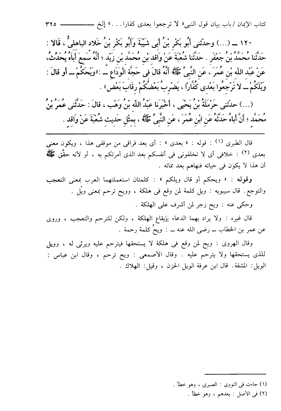 120 - (...) وحدّثنى أَبُو بَكْرِ بْنُ أَبِى شَيْبَةَ وَأَبُو بَكْرِ بْنُ خَلادٍ الباهِلِىُّ، قَالا: حَدَّثَنَا مُحَمَّدُ بْنُ جَعْفَرٍ. حَدَّثَنَا شُعْبَةَ عَنْ وَاقِدِ بْنِ مُحَمَّدِ بْنِ زَيْدٍ؛ أَنَّهُ سَمِعَ أَبَاهُ يُحَدِّثُ، عَنْ عَبْدِ اللهِ بْنِ عُمَرَ، عَنِ النَّبِىِّ صَلَّى اللهُ عَلَيْهِ وَسَلَّمَ أَنَّهُ قالَ فِى حَجَّةِ الْوَدَاعِ -: " وَيْحَكُمْ - أَو قالَ: وَيْلَكُمْ - لا تَرْجِعُوا بَعْدِى كُفَّارًا، يَضْرِبُ بَعْضُكُمْ رِقَابَ بَعْض ".