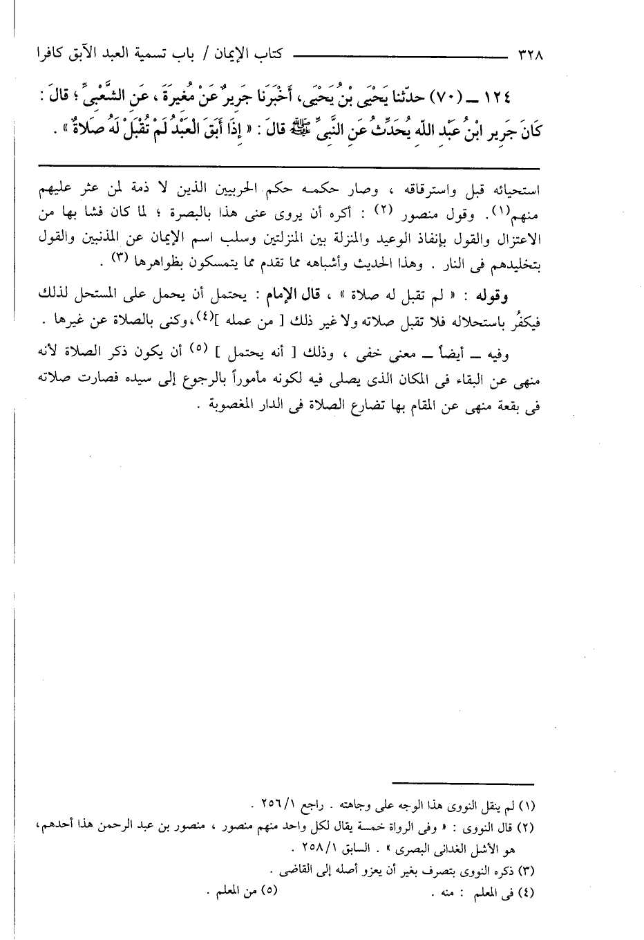 124 - (70) حدّثنا يَحْيَى بْنُ يَحْيَى، أَخْبَرَنا جَرِيرٌ عَنْ مُغِيرَةَ، عَنِ الشَّعْبِىِّ؛ قالَ: كَانَ جَرِير ابْنُ عَبْدِ اللهِ يُحَدِّثُ عَنِ النَّبِىِّ صَلَّى اللهُ عَلَيْهِ وَسَلَّمَ قالَ: " إِذَا أَبَقَ الْعَبْدُ لَمْ تُقْبَلْ لَهُ صَلاةٌ ".