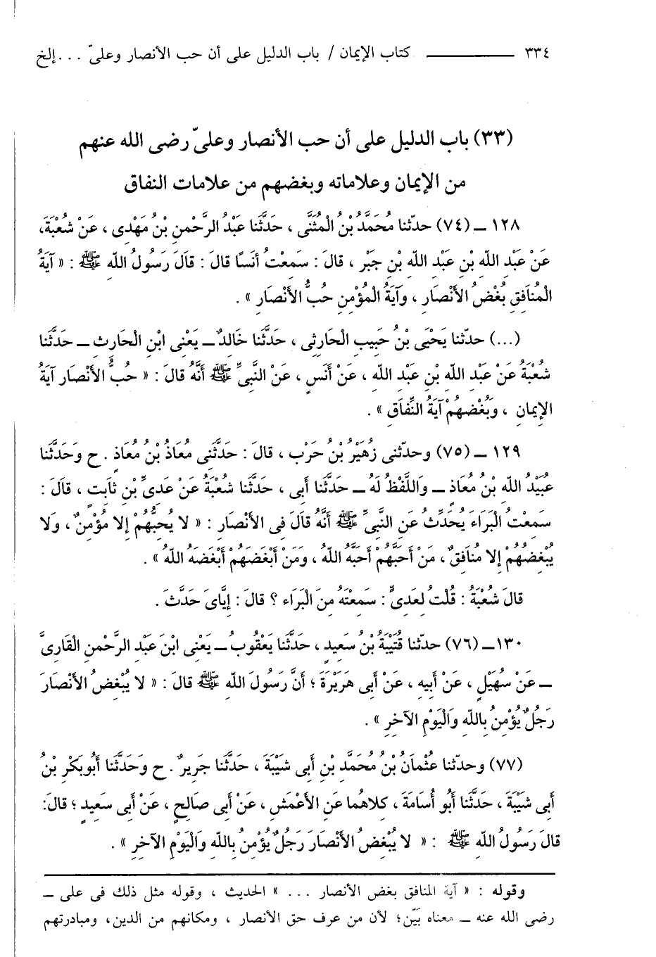 (77) وحدّثنا عُثْمَانُ بْنُ مُحَمَّدِ بْنِ أَبِى شَيْبَةَ، حَدَّثَنَا جَرِيرٌ. ح وَحَدَّثَنَا أَبُو بَكْرِ بْنُ أَبِى شَيْبَةَ، حَدَّثَنَا أَبُو أُسَامَةَ، كِلاهُما عَنِ الأَعْمَشِ، عَنْ أَبِى صَالِحٍ، عَنْ أَبِى سَعِيدٍ، قالَ: قالَ رَسُولُ اللهِ صَلَّى اللهُ عَلَيْهِ وَسَلَّمَ: " لا يُبْغِضُ الأَنْصَارَ رَجُلٌ يُؤمِنُ بِاللهِ وَالْيَوْمِ الآخِرِ ".