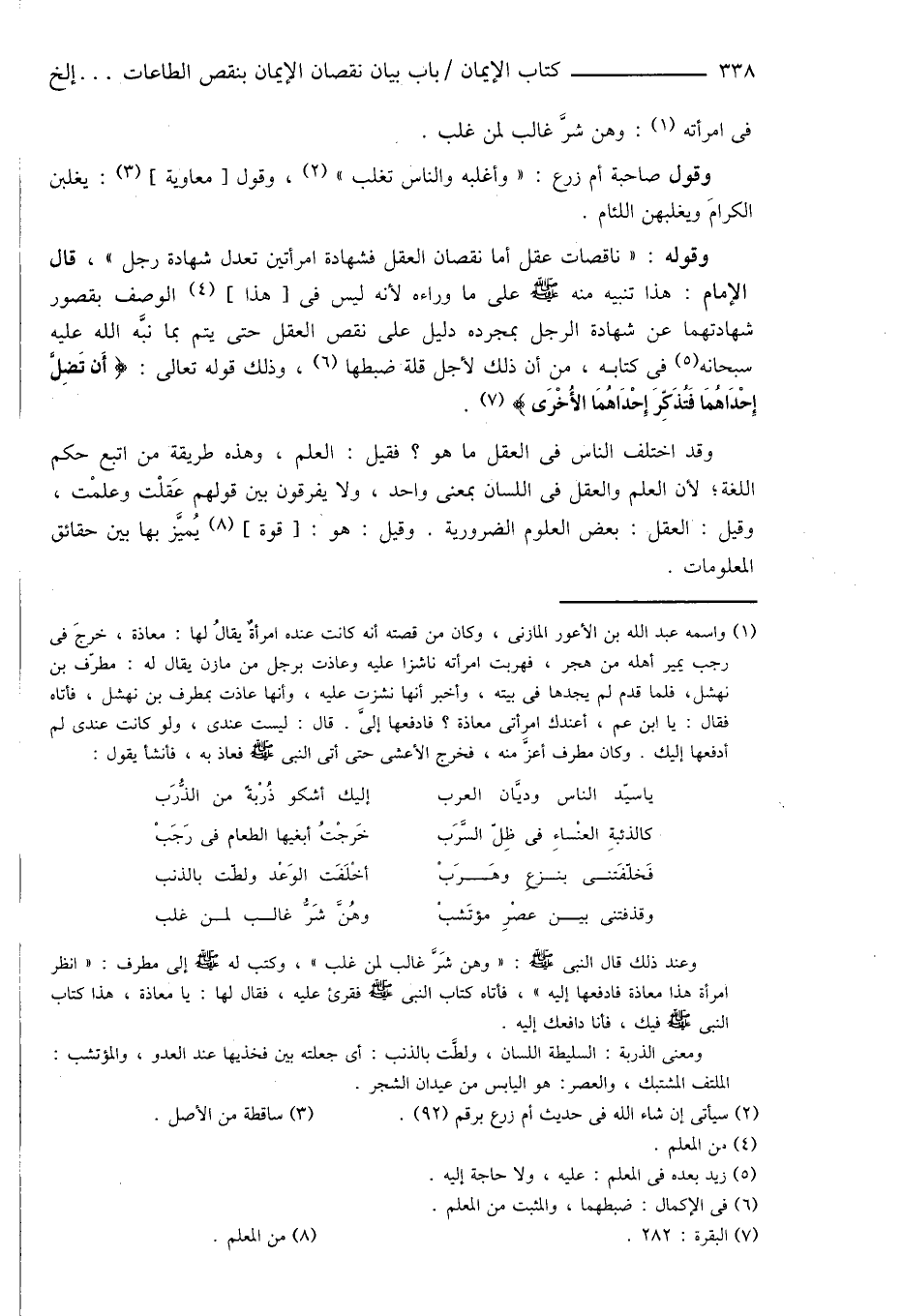 وقوله: " ناقصات عقل أما نقصان العقل فشهادة امرأتين تعدل شهادة رجل "، قال الإمام: هذا تنبيه منه صَلَّى اللهُ عَلَيْهِ وَسَلَّمَ على ما وراءه لأنه ليس فى [هذا] (¬4) الوصف بقصور شهادتهما عن شهادة الرجل بمجرده دليل على نقص العقل حتى يتم بما نبَّه الله عليه سبحانه (¬5) فى كتابه، منِ أن ذلك لأجل قلة ضبطها (¬6)، وذلك قوله تعالى: {أَن تَضِلَّ إِحْدَاهُمَا فَتُذَكِّرَ إِحْدَاهُمَا الأُخرى} (¬7).