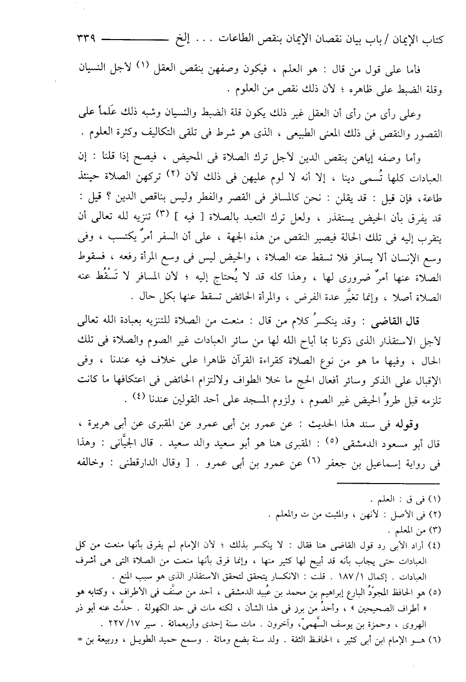 وأما وصفه إياهن بنقص الدين لأجل ترك الصلاة فى الحيض، فيصح إذا قلنا: إن العبادات كلها تُسمى ديناً، إلا أنه لا لوم عليهن فى ذلك لأن (¬2) تركهن الصلاة حينئذ طاعة، فإن قيل: قد يقلن: نحن كالمسافر فى القصر والفطر وليس بناقص الدين؟ قيل: قد يفرق بأن الحيض يستقذر، ولعل ترك التعبد بالصلاة [فيه] (¬3) تنزيه لله تعالى أن يتقرب إليه فى تلك الحالة فيصير النقص من هذه الجهة، على أن السفر أمر يكتسب، وفى وسع الإنسان ألا يسافر فلا تسقط عنه الصلاة، والحيض ليس فى وسع المرأة رفعه، فسقوط الصلاة عنها أمرٌ ضرورى لها، وهذا كله قد لا يُحتاج إليه؛ لأن المسافر لا تَسْقُط عنه الصلاة أصلاً، وإنما تغيَّر عدة الفرض، والمرأة الحائض تسقط عنها بكل حال.