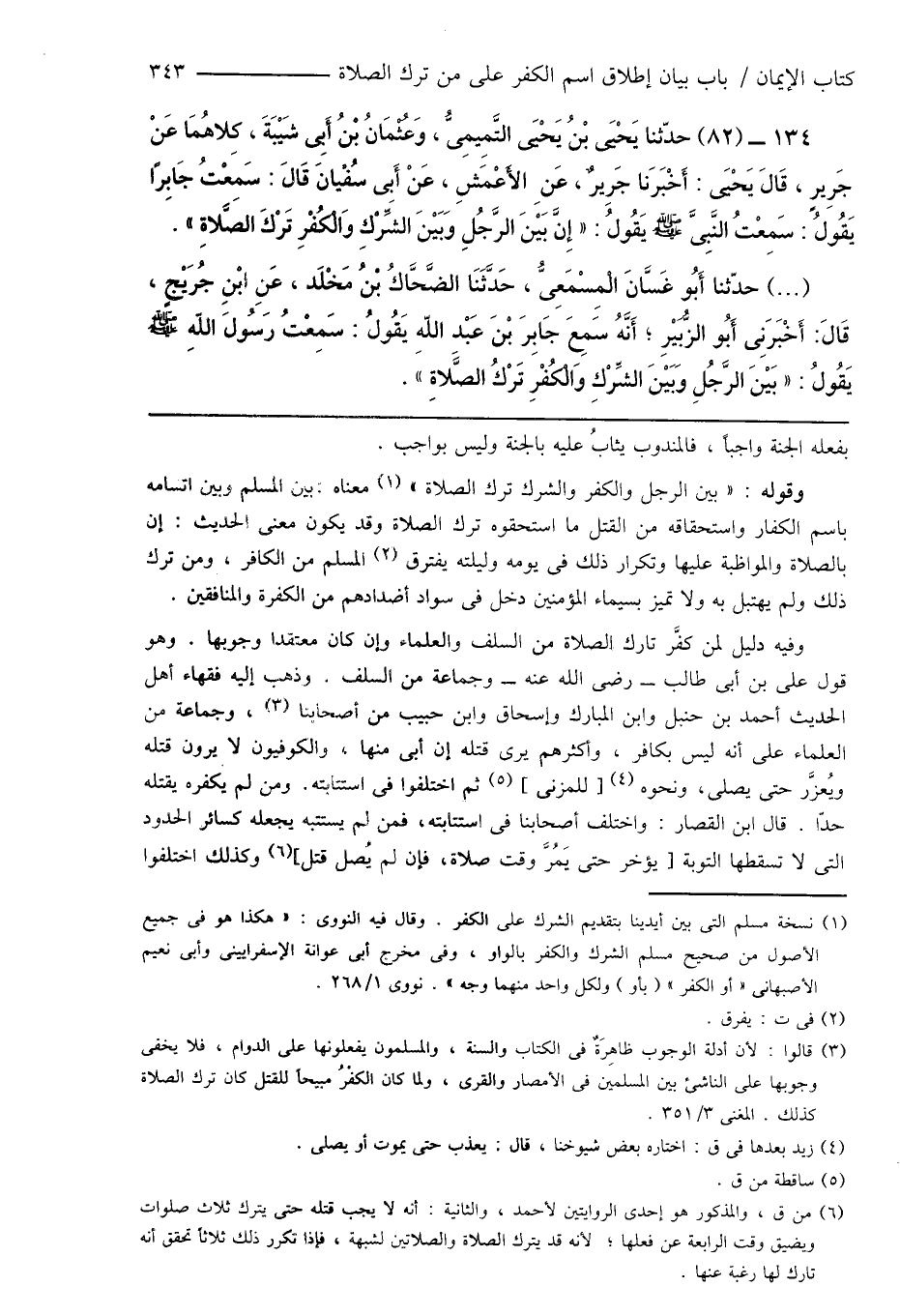 (¬1) نسخة مسلم التى بين أيدينا بتقديم الشرك على الكفر. وقال فيه النووى: " هكذا هو فى جميع الأصول من صحيح مسلم الشرك والكفر بالواو، وفى مخرج أبى عوانة الإسفرايينى وأبى نعيم الأصبهانى " أو الكفر " (بأو) ولكل واحد منهما وجه " نووى 1/ 268.