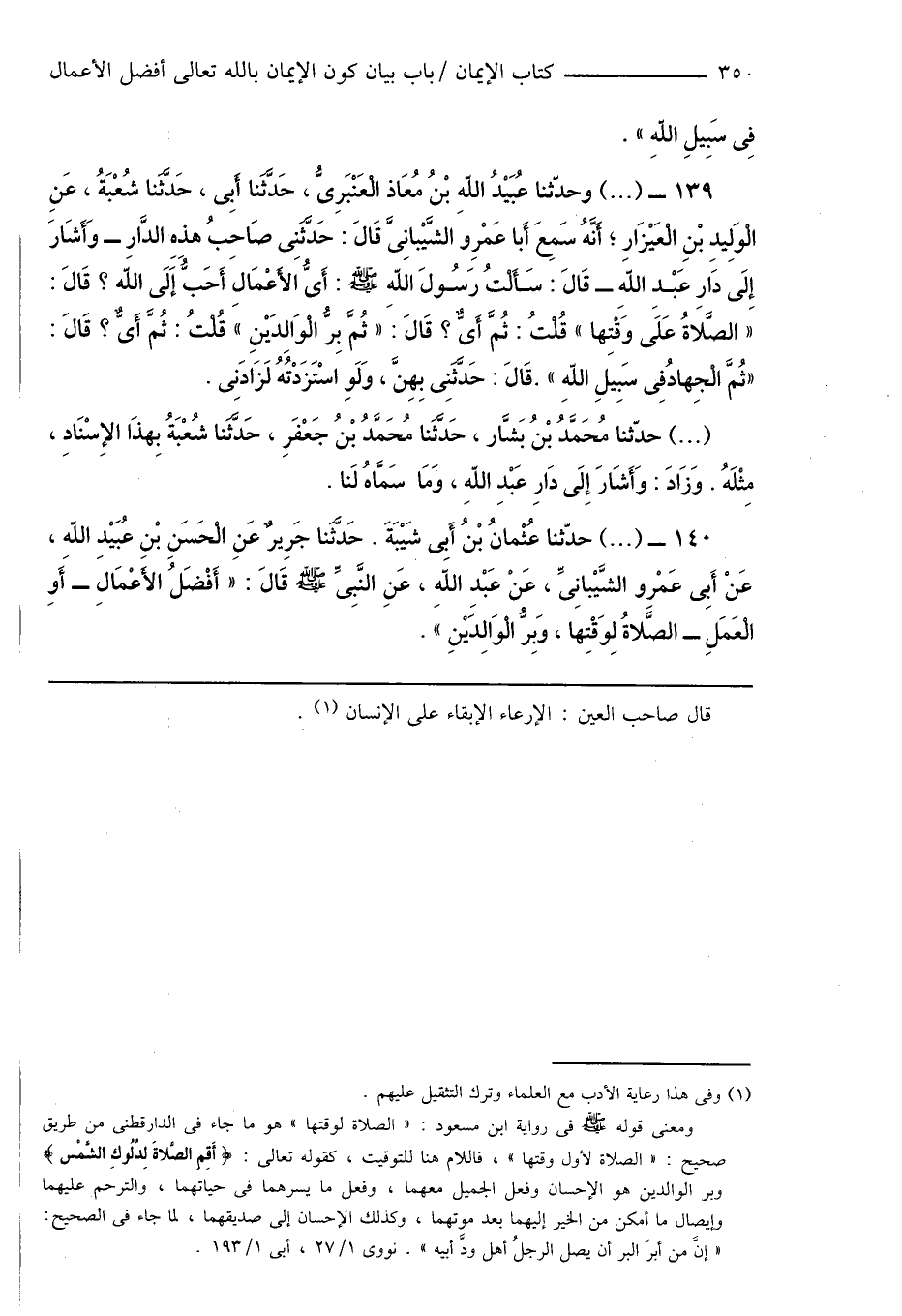 140 - (...) حدّثنا عُثْمانُ بْنُ أَبِى شَيْبَةَ. حَدَّثَنَا جَرِيرٌ عَنِ الْحَسَنِ بْنِ عُبَيْدِ اللهِ، عَنْ أَبِى عَمْرِو الشَّيْبانِىِّ، عَنْ عَبْدِ اللهِ، عَنِ النَّبِىِّ صَلَّى اللهُ عَلَيْهِ وَسَلَّمَ قَالَ: " أَفْضَلُ الأَعْمَالَ - أَوِ الْعَمَلِ - الصَّلاةُ لِوَقْتِها، وَبِرُّ الْوَالِدَيْنِ ".