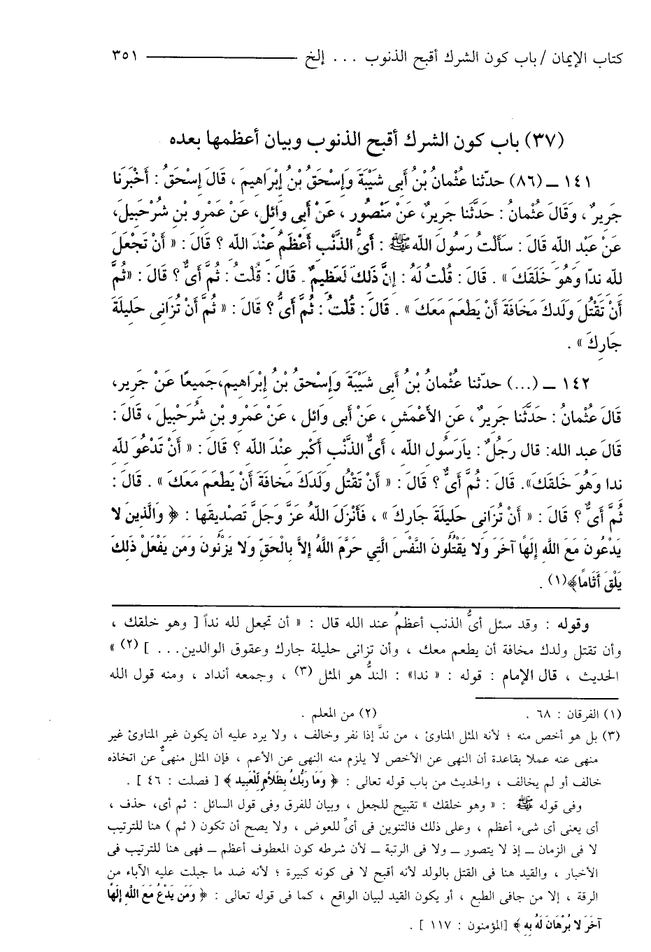 142 - (...) حدّثنا عُثْمانُ بْنُ أَبِى شَيْبَةَ وَإِسْحَاقُ بْنُ إِبْرَاهِيمَ، جَمِيعًا عَنْ جَرِير، قَالَ عُثْمانُ: حَدَّثَنَا جَرِيرٌ، عَنِ الأَعْمَشِ، عَنْ أَبى وَائِل، عَنْ عَمْرِو بْنِ شُرَحْبِيلَ، قَالَ: قَالَ عبد الله: قال رَجُلٌ: يَا رَسُولِ اللهِ، أَىٌّ الذَّنْبِ أَكْبر عِنْدَ اللهِ؟ قَالَ: " أَنْ تَدْعُوَ لِلّهِ نِدًّا وَهُوَ خَلقَكَ ". قَالَ: ثُمَّ أَىٌّ؟ قَالَ: " أَنْ تَقْتُل وَلَدَكَ مَخافَةَ أَنْ يَطْعَمَ مَعَكَ ". قَالَ: ثُمَّ أَىٌّ؟ قَالَ: " أَنْ تُزَانِى حَليلَةَ جَارِكَ "، فَأَنْزَلَ اللَّهُ عَزَّ وَجَلَّ تَصْدِيقَها: {وَالَّذِينَ لا يَدْعُونَ مَعَ اللَّهِ إِلَهًا آخَرَ وَلا يَقْتُلُونَ النَّفْسَ الَّتِي حَرَّمَ اللَّهُ إِلَّا بِالْحَقِّ وَلا يَزْنُونَ وَمَن يَفْعَلْ ذَلِكَ يَلْقَ أَثَامًا} (¬1).