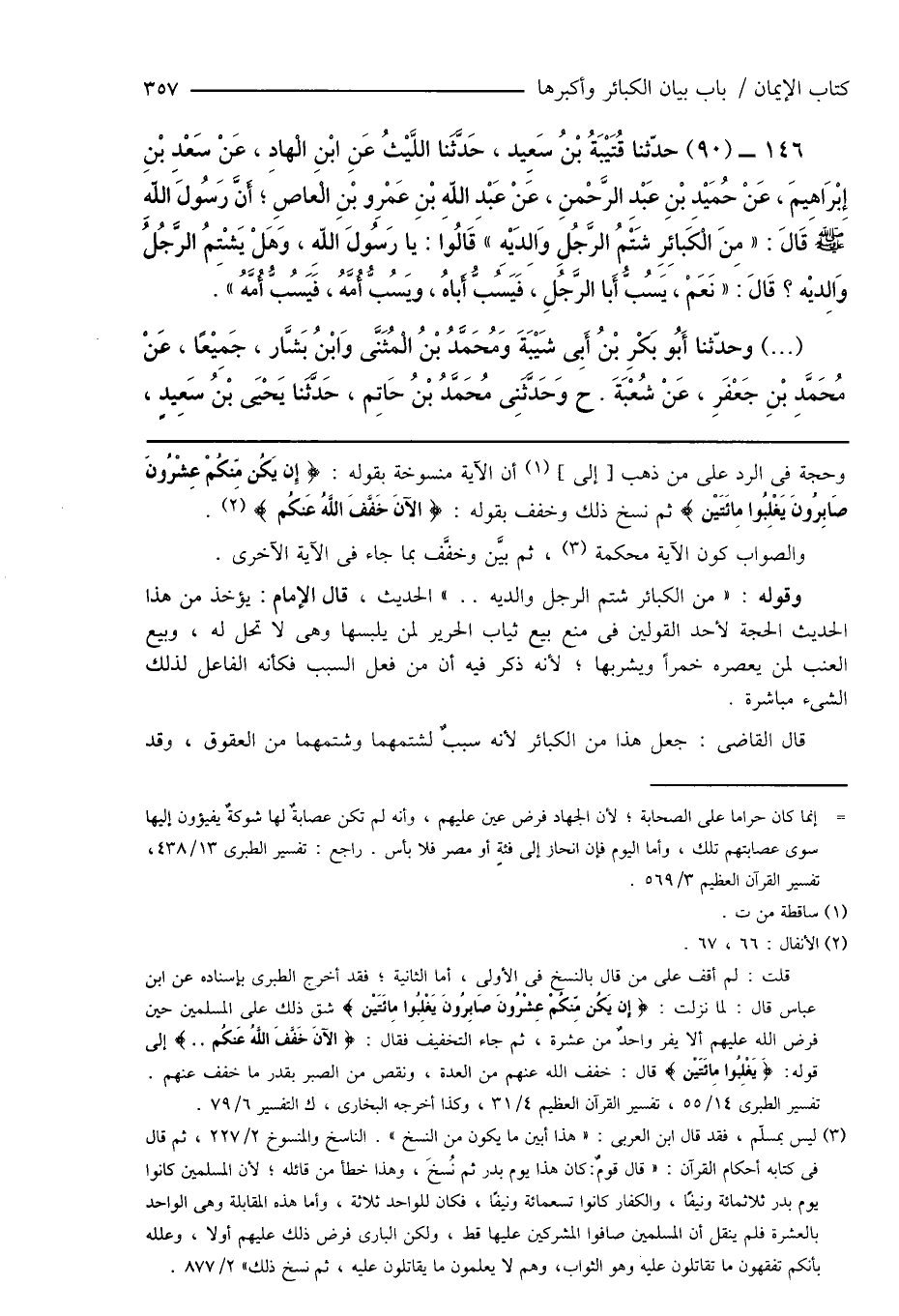 146 - (90) حدّثنا قُتَيْبَةُ بْنُ سَعِيد، حَدَّثَنَا اللَّيْثُ عَنِ ابْنِ الْهادِ، عَنْ سَعْدِ بْنِ إِبْرَاهِيمَ، عَنْ حُمَيْدِ بْنِ عَبْدِ الرَّحْمنِ، عَنْ عَبْدِ اللهِ بْنِ عَمْرِو بْنِ الْعَاصِ؛ أَنَّ رَسُولَ اللهِ صَلَّى اللهُ عَلَيْهِ وَسَلَّمَ قَالَ: " مِنَ الْكَبائِرِ شَتْمُ الرَّجُلِ وَالِدَيْهِ " قَالُوا: يا رَسُولَ اللهِ، وَهَلْ يَشْتِمُ الرَّجُلُ وَالِديْه؟ قَالَ: " نَعَمْ، يَسُبُّ أَبا الرَّجُلِ، فَيَسُبُّ أَباهُ، ويَسُبُّ أُمَّهُ، فَيَسُبُّ أُمَّهُ ".