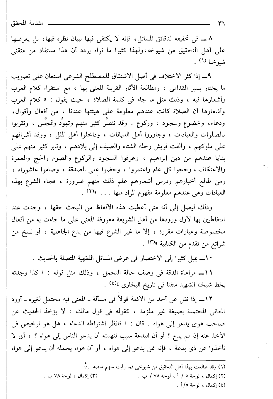 8 - فى تحقيقه لدقائق المسائل، فإنه لا يكتفى فيها ببيان نظره فيها، بل يعرضها على أهل التحقيق من شيوخه، ولهذا كثيراً ما نراه يردد أن هذا مستفاد من متقنى شيوخنا (¬1).