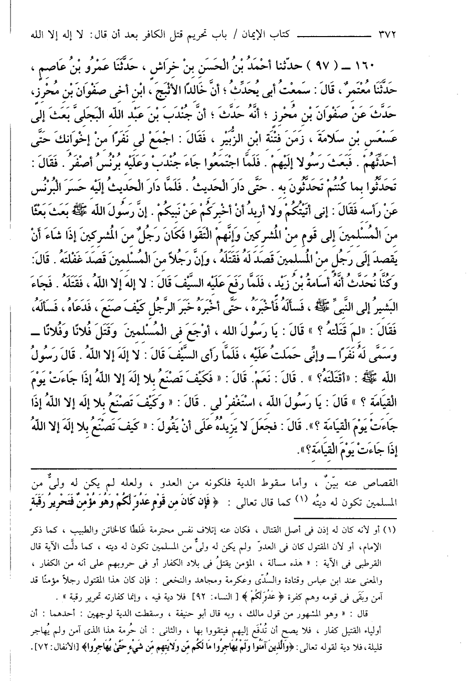 160 - (97) حدّثنا أَحْمَدُ بْنُ الْحَسَنِ بِنْ خِرَاشٍ، حَدَّثَنَا عَمْرُو بْنُ عَاصِمٍ، حَدَّثَنَا مُعْتَمِرٌ، قَالَ: سَمِعْتُ أبى يُحَدِّثُ؛ أَنَّ خَالِدًا الأثْبَجَ، ابْنِ أخِى صَفْوَانَ بْنِ مُحْرِزٍ، حَدَّثَ عَنْ صَفْوَانَ بْنِ مُحْرِزٍ؛ أَنَّهُ حَدَّثَ؛ أَنَّ جُنْدَبَ بْنَ عَبْدِ اللهِ الْبَجَلِىَّ بَعَثَ إلى عَسْعَسِ بْنِ سَلامَةَ، زَمَنَ فِتْنَةِ ابْنِ الزُّبَيْرِ، فَقَالَ: اجْمَعْ لِى نَفَرًا مِنْ إخْوَانِكَ حَتَّى أحَدِّثَهُمْ. فَبَعَثَ رَسُولاً إلَيْهمْ. فَلَمَّا اجْتَمَعُوا جَاءَ جُنْدَبْ وَعَلَيْهِ بُرْنُسُ أصْفَرُ. فَقَالَ: تَحَدَّثُوا بِما كُنتُمْ تَحَدَّثُونَ بِهِ. حَتَّى دَارَ الْحَدِيثُ. فَلَمَّا دَارَ الْحَدِيثُ إلَيْهِ حَسَرَ الْبُرْنُس عَنْ رَأسِهِ فَقَالَ: إنى أتَيْتُكُمْ ولا أرِيدُ أَنْ أخْبِرَكُمْ عَنْ نَبِيكُمْ. إِنَّ رَسُولَ الله صَلَّى اللهُ عَلَيْهِ وَسَلَّمَ بَعَثَ بَعْثًا مِنَ الْمُسْلِمِينَ إِلى قَومِ مِنْ المُشرِكِينَ وَإِنَّهمْ الْتَقَوا فَكَانَ رَجُلٌ مِنَ المُشرِكِينَ إِذَا شَاءَ أَنْ يَقصِدَ إلَى رَجُلٍ مِنْ المُسلِمينَ قَصَدَ لَهُ فَقَتَلَهُ، وَإنَّ رَجُلاً مِنَ الْمُسْلِمِينَ قَصَدَ غَفْلتَهُ. قَالَ: وَكُنَّا نُحَدَّثُ أَنَّهُ أسَامةُ بْنُ زَيْدٍ، فَلَمَّا رَفَعَ عَلَيْهِ السَّيْفَ قَالَ: لا إلهَ إلا اللهُ، فَقَتَلَهُ. فَجَاءَ البَشِيرُ إلى النَّبِىِّ صَلَّى اللهُ عَلَيْهِ وَسَلَّمَ، فَسأَلَهُ فَأخْبَرَهُ، حَتَّى أَخْبَرَهُ خَبَرَ الرَّجُلِ كَيْفَ صَنَعَ، فَدَعَاهُ، فَسَألَهُ، فَقَالَ: " لِمَ قَتَلْتهُ؟ " قَالَ: يَا رَسُولَ اللهِ، أوْجَعَ فِى الْمُسْلِمِينَ وَقَتَلَ فُلانًا وَفُلانًا - وَسَمَّى لَهُ نَفَرًا - وإنِّى حَمَلتُ عَلَيْهِ، فَلَمَّا رَأى السَّيْفَ قَالَ: لَا إلَهَ إلا اللهُ. قَالَ رَسُولُ اللهِ صَلَّى اللهُ عَلَيْهِ وَسَلَّمَ: " أقَتَلْتَهُ؟ ". قَالَ: نَعَمْ. قَالَ: " فَكَيْفَ تَصْنَعُ بِلا إلَهَ إلا اللهُ إِذَا جَاءَتْ يَوْمَ الْقِيَامَةِ؟ " قَالَ: يَا رَسُولَ اللهِ، اسْتَغْفِرْ لِى. قَالَ: " وَكَيْفَ تَصْنَعُ بِلا إلَه إلا اللهُ إِذَا جَاءَتْ يَوْمَ الْقِيَامَةِ؟ ". قَالَ: فجَعَلَ لا يَزِيدُهُ عَلَى أَنْ يَقُولَ: " كَيفَ تَصْنَعُ بِلا إلَهَ إلا اللهُ إِذَا جَاءَتْ يَوْمَ الْقِيَامَةِ؟ ".