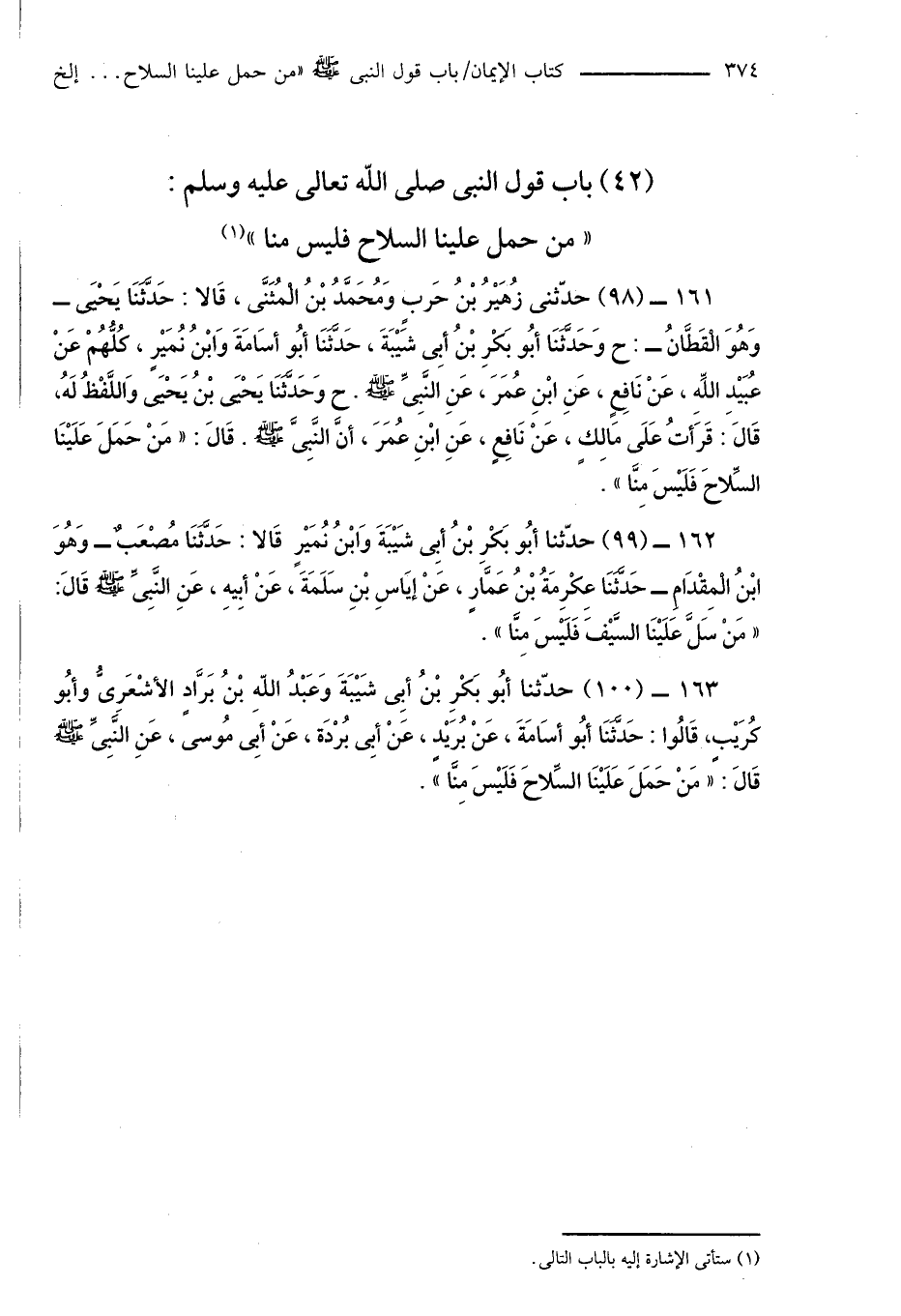 161 - (98) حدّثنى زُهَيْرُ بْنُ حَربٍ وَمُحَمَّدُ بْنُ الْمُثَنَّى، قَالا: حَدَّثَنَا يَحْيَى - وَهُوَ الْقَطَّانُ -: ح وَحَدَّثَنَا أَبُو بَكْرِ بْنُ أَبِى شَيْبَةَ، حَدَّثَنَا أَبُو أسَامَةَ وَابْنُ نُمَيْرٍ، كُلُّهُمْ عَنْ عُبَيْدِ اللهِ، عَنْ نَافِعٍ، عَنِ ابْنِ عُمَرَ، عَنِ النَّبِىِّ صَلَّى اللهُ عَلَيْهِ وَسَلَّمَ. ح وَحَدَّثَنَا يَحْيَى بْنُ يَحْيَى وَاللَّفْظُ لَهُ، قَالَ: قَرَأتُ عَلَى مَالِكٍ، عَنْ نَافِعٍ، عَنِ ابْنِ عُمَرَ، أَنَّ النَّبِىَّ صَلَّى اللهُ عَلَيْهِ وَسَلَّمَ. قَالَ: " مَنْ حَمَلَ عَلَيْنَا السِّلاحَ فَلَيْسَ مِنَّا ".