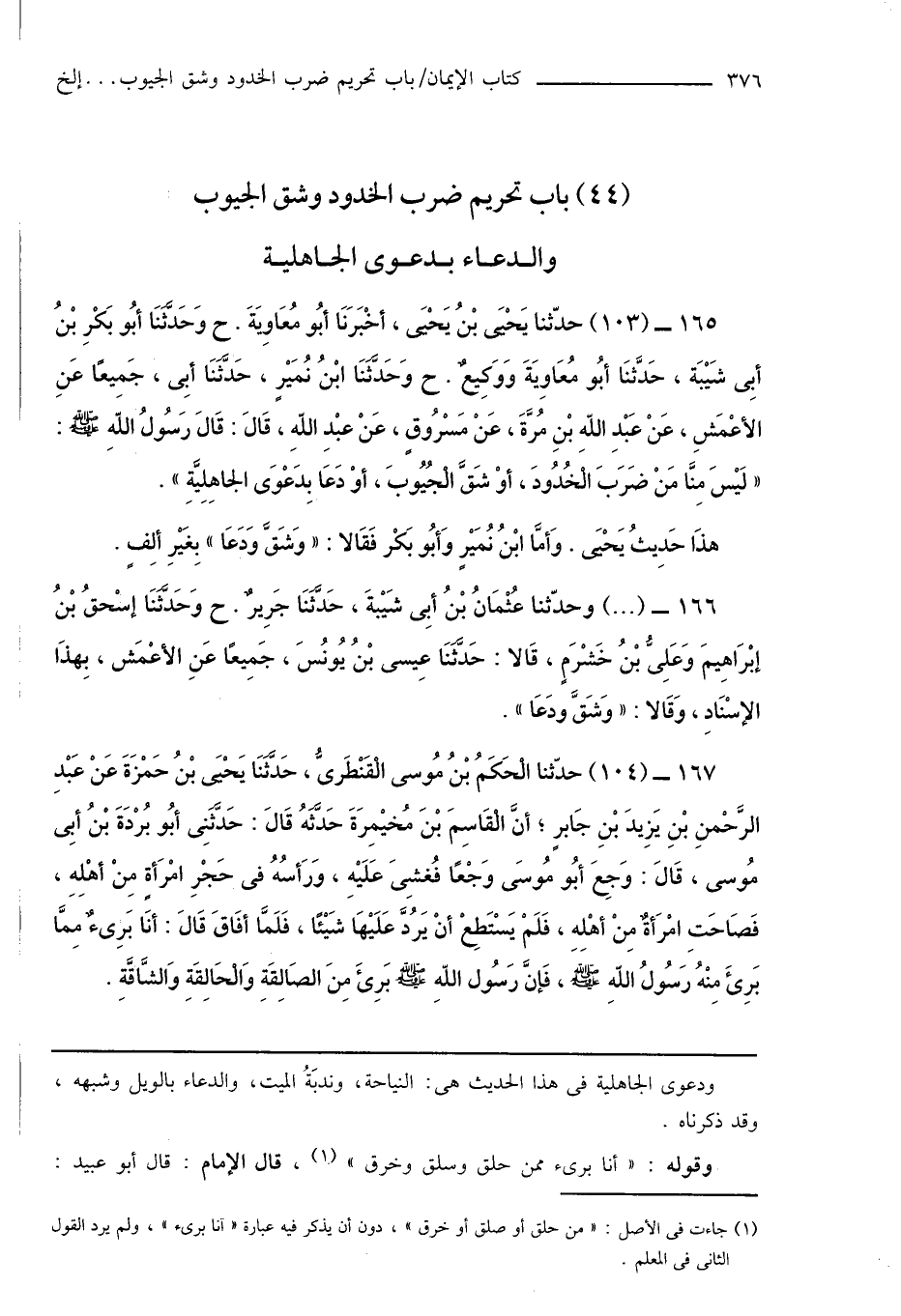 165 - (103) حدّثنا يَحْيَى بْنُ يَحْيَى، أَخْبَرَنَا أَبُو مُعَاوِيَةَ. ح وَحَدَّثَنَا أَبُو بَكْرِ بْنُ أَبِى شَيْبَة، حَدَّثَنَا أَبُو مُعَاوِيَةَ وَوَكِيعٌ. ح وَحَدَّثَنَا ابْنُ نُمَيْرٍ، حَدَّثَنَا أَبِى، جَمِيعًا عَنِ الأَعْمَشِ، عَنْ عَبْدِ اللهِ بْنِ مُرَّةَ، عَنْ مَسْرُوقٍ، عَنْ عبْدِ اللهِ، قَالَ: قَالَ رَسُولُ اللهِ صَلَّى اللهُ عَلَيْهِ وَسَلَّمَ: " لَيْسَ مِنَّا مَنْ ضَرَبَ الْخُدُودَ، أَوْ شَقَّ الْجُيُوبَ، أَوْ دَعَا بِدَعْوَى الجاهِلِيَّةِ ".