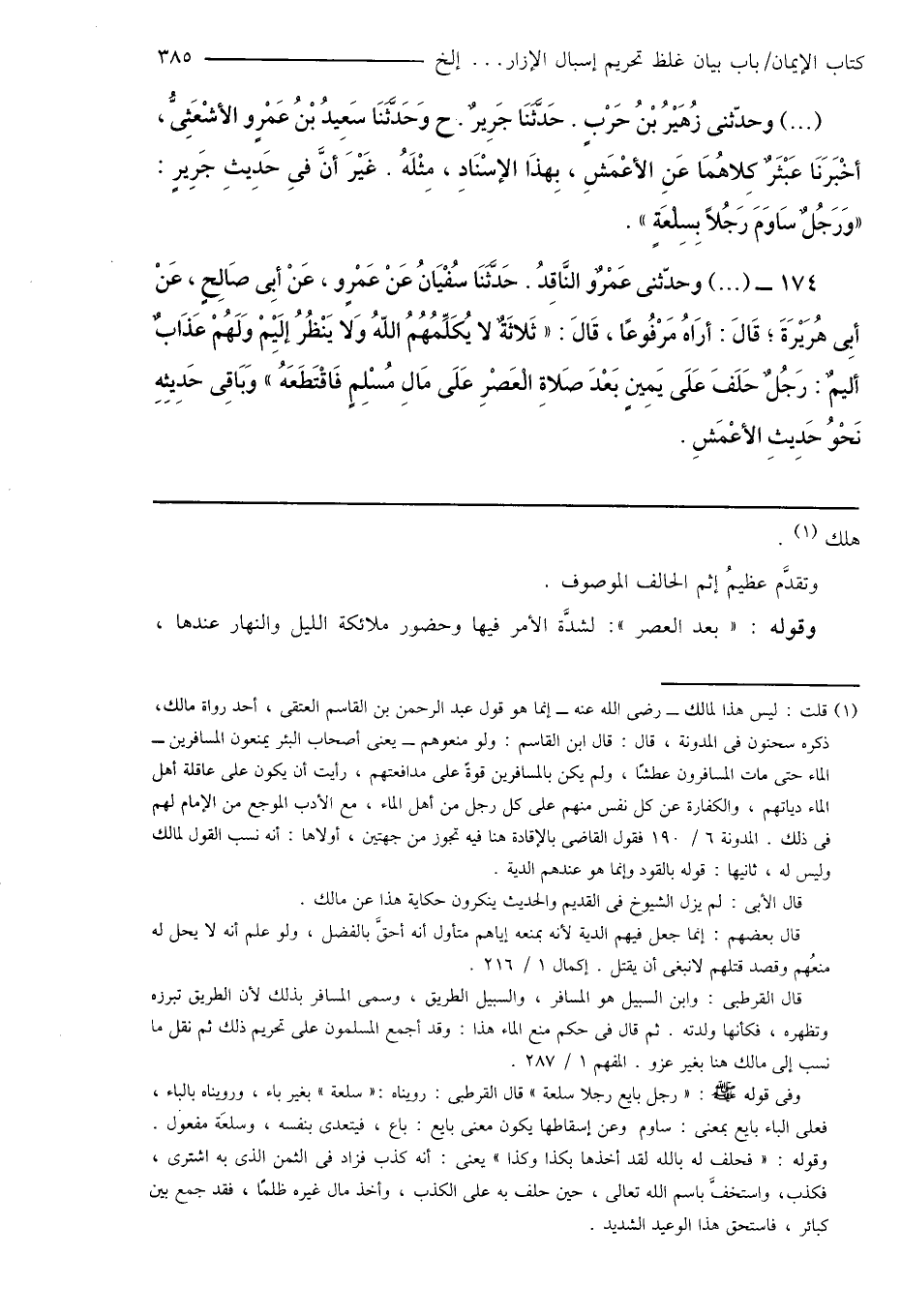 174 - (...) وحدّثنى عَمْرٌو النَّاقِدُ. حَدَّثَنَا سُفْيَانُ عَنْ عَمْرٍو، عَنْ أَبِى صَالِحٍ، عَنْ أَبِى هُرَيْرَةَ، قَالَ: أرَاهُ مَرْفُوعًا، قَالَ: " ثَلاثَةٌ لا يُكَلِّمُهُمُ اللهُ وَلا يَنْظُرُ إلَيْهمْ وَلَهُمْ عَذَابٌ أليمٌ: رَجُلٌ حَلَفَ عَلَى يَمِينٍ بَعْدَ صَلاةِ الْعَصْرِ عَلَى مَالِ مُسْلِمٍ فَاقْتَطَعَهُ " وَبَاقِى حَدِيثِهِ نَحْوُ حَدِيثِ الأَعْمَشِ.