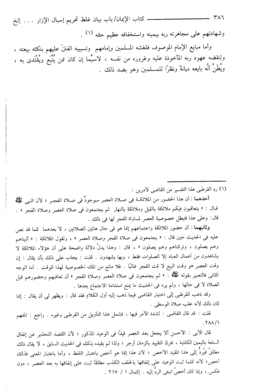 قال الأبى: الأحسن ألا يجعل بعد العصر قيدًا فى الوعيد المذكور؛ لأن القصد التحذير عن إنفاق السلعة باليمين الكاذبة، فترك التقييد بالزمان أزجر؛ ولذا لم يقيده بذلك فى الحديث السابق، لا يقال ذلك مطلقُ فيُردُّ إلى هذا المقيد الأخص؛ لأن هذا إنما هو أخص باعتبار اللفظ، وأما باعتبار المعنى فذلك أخص؛ لأنه كلما ثبت الوعيد على إنفاقها بالحلف الكذب مطلقًا ثبت على إنفاقها به بعد العصر، دون عكس، وإذا كان أخصَّ انبغى الردُّ إليه. إكمال 1/ 217.
