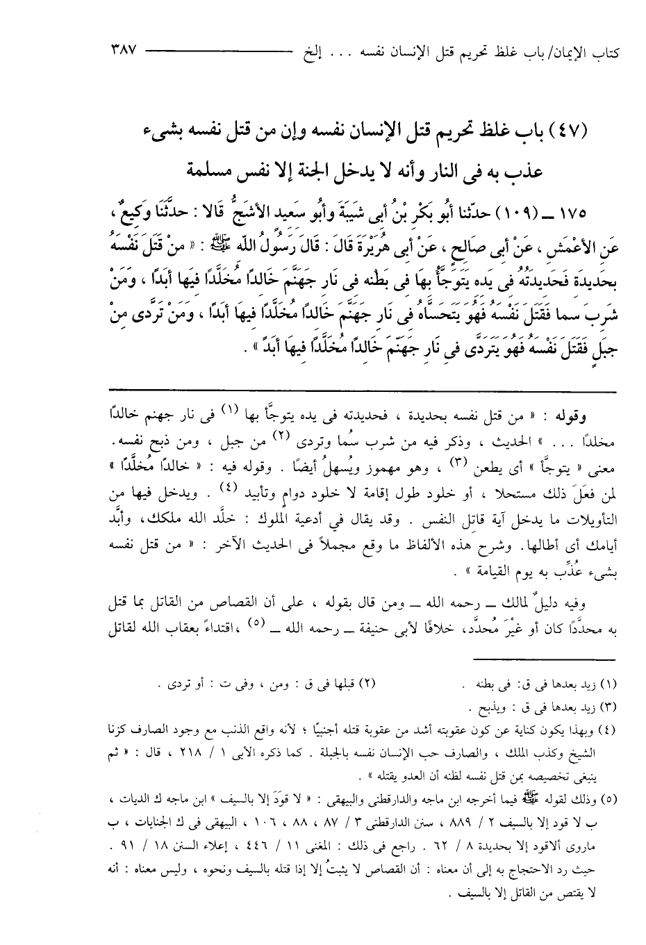175 - (109) حدّثنا أَبُو بَكْرِ بْنُ أَبِى شَيْبَةَ وأبُو سَعِيدٍ الأَشَجُّ قَالا: حَدَّثَنَا وَكِيعٌ، عَنِ الأَعْمَشِ، عَنْ أَبِى صَالِحٍ، عَنْ أَبِى هُرَيْرَةَ قَالَ: قَالَ رَسُولُ اللهِ صَلَّى اللهُ عَلَيْهِ وَسَلَّمَ: " منْ قَتَلَ نَفْسَهُ بحَديدَةٍ فَحَدِيدَتُهُ فِى يَدِهِ يَتَوَجَّأُ بِهَا فِى بَطْنه فِى نَارِ جَهَنَّمَ خَالِدًا مُخَلَّدًا فِيهَا أبَدًا، وَمَنْ شَرِبَ سمًّا فَقَتَلَ نَفْسَهُ فَهُوَ يَتَحَسَّاهُ فِى نَارِ جَهَنَّمَ خَالِدًا مُخَلَّدًا فِيهَا أبَدًا، وَمَنْ تَردَّى مِنْ جبَلٍ فَقَتَلَ نَفْسَهُ فَهُوَ يَتَرَدَّى فِى نَارِ جَهَنّمَ خَالِدًا مُخَلَّدًا فِيهَا أبَدًا ".