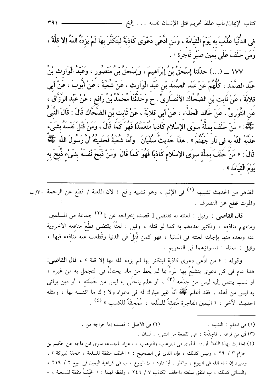 177 - (...) حدّثنا إِسْحَاقُ بْنُ إبْرَاهِيمَ، وَإِسْحَاقُ بْنُ مَنْصُورٍ، وَعَبْدُ الْوَارِثِ بْنُ عَبْدِ الصَّمَدِ، كُلُّهُمْ عَنْ عَبْد الصَّمَدِ بْن عَبْدِ الْوَارِثِ، عَنْ شُعْبَةَ، عَنْ أَيُّوبَ، عَنْ أَبِى قِلابَةَ، عَنْ ثَابِتِ بْنِ الضَّحَّاكَ الأنْصَارِىِّ. ح وَحَدَّثَنَا مُحَمَّدُ بْنُ رَافِعٍ، عْنْ عَبْدِ الرَّزَّاقِ، عَنِ الثَّوْرِىِّ، عَنْ خَالِد الْحَذَّاءِ، عَنْ أَبِى قِلابَةَ، عَنْ ثَابِتِ بْنِ الضَّحَّاكِ قَالَ: قَالَ النَّبِىُّ صَلَّى اللهُ عَلَيْهِ وَسَلَّمَ: " مَنْ حَلَفَ بِمِلَّةٍ سِوَى الإِسْلامِ كَاذِبًا مُتَعَمِّدًا فَهُوَ كَمَا قَالَ، وَمَنْ قَتَلَ نَفْسَهُ بِشَىْءٍ عَذَّبَهُ اللهُ بِهِ فِى نَارِ جَهَنَّمَ ". هذَا حَدِيثُ سُفْيَانَ. وَأمَا شُعْبَةُ فَحَدِيثُهُ أَنَّ رَسُولَ اللهَ صَلَّى اللهُ عَلَيْهِ وَسَلَّمَ قَالَ: " مَنْ حَلَفَ بِملِّةٍ سِوَى الإسْلامِ كَاذِبًا فَهُوَ كَمَا قَالَ وَمَنْ ذَبَحَ نْفسَهُ بِشَىْءٍ ذُبِحَ بِهِ يَوْمَ الْقِيَامَةِ ".