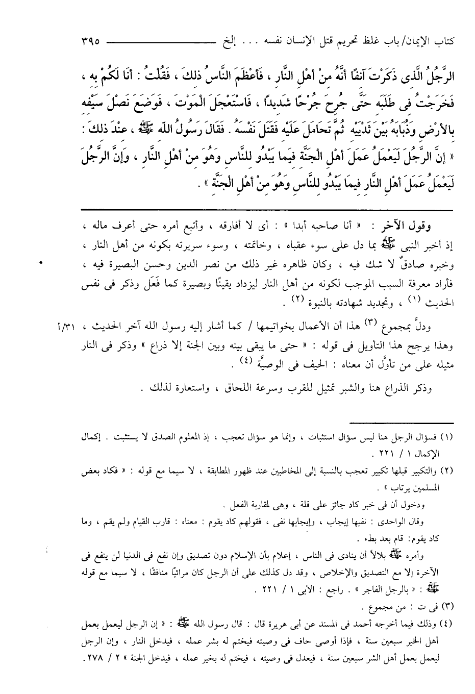 الرَّجُلُ الَّذِى ذَكَرْتَ آنِفًا أَنَّهُ مِنْ أَهْلِ النَّارِ، فَأعْظَمَ النَّاسُ ذلِكَ، فَقُلْتُ: أَنَا لَكُمْ بِهِ، فَخَرَجْتُ فِى طَلَبَهِ حَتَّى جُرِحَ جُرْحًا شَدِيدًا، فَاسْتَعْجَلَ الْمَوْتَ، فَوَضَعَ نَصْلَ سَيْفِهِ بِالأرْضِ وَذُبَابَهُ بَيْنَ ثَدْيَيْهِ ثُمَّ تَحَامَلَ عَلَيْهِ فَقَتَلَ نَفْسَهُ. فَقَالَ رَسُولُ اللهِ صَلَّى اللهُ عَلَيْهِ وَسَلَّمَ، عِنْدَ ذلِكَ: " إِنَّ الرَّجُلَ لَيَعْمَلُ عَمَلَ أَهْلِ الْجَنَّةِ فِيَما يَبْدُو لِلنَّاسِ وَهُوَ مِنْ أَهْلِ النَّارِ، وَإنَّ الرَّجُلَ لَيَعْمَلُ عَمَلَ أَهْلِ النَّارِ فِيمَا يَبْدُو لِلنَّاسِ وَهُوَ مِن أَهْلِ الْجَنَّةِ ".