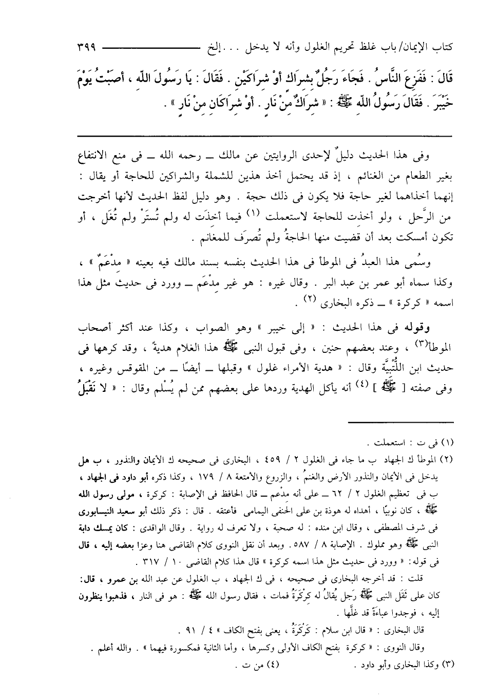 (¬2) الموطأ ك الجهاد ب ما جاء فى الغلول 2/ 459، البخارى فى صحيحه ك الأيمان والنذور، ب هل يدخل فى الأيمان والنذور الأرض والغنمُ، والزروع والأمتعة 8/ 179، وكذا ذكره أبو داود فى الجهاد، ب فى تعظيم الغلول 2/ 62 - على أنه مِدْعم - قال الحافظ فى الإصابة: كركرة، مولى رسول الله صَلَّى اللهُ عَلَيْهِ وَسَلَّمَ، كان نوبيًا، أهداه له هوذة بن على الحنفى اليمامى فأعتقه. قال: ذكر ذلك أبو سعيد النيسابورى فى شرف المصطفى، وقال ابن منده: له صحبة، ولا تعرف له رواية. وقال الواقدى، كان يمسك دابة النبى صَلَّى اللهُ عَلَيْهِ وَسَلَّمَ وهو مملوك. الإصابة 8/ 587. وبعد أن نقل النووى كلام القاضى هنا وعزا بعضه إليه، قال فى قوله: " وورد فى حديث مثل هذا اسمه كركرة " قال هذا كلام القاضى 10/ 317.
