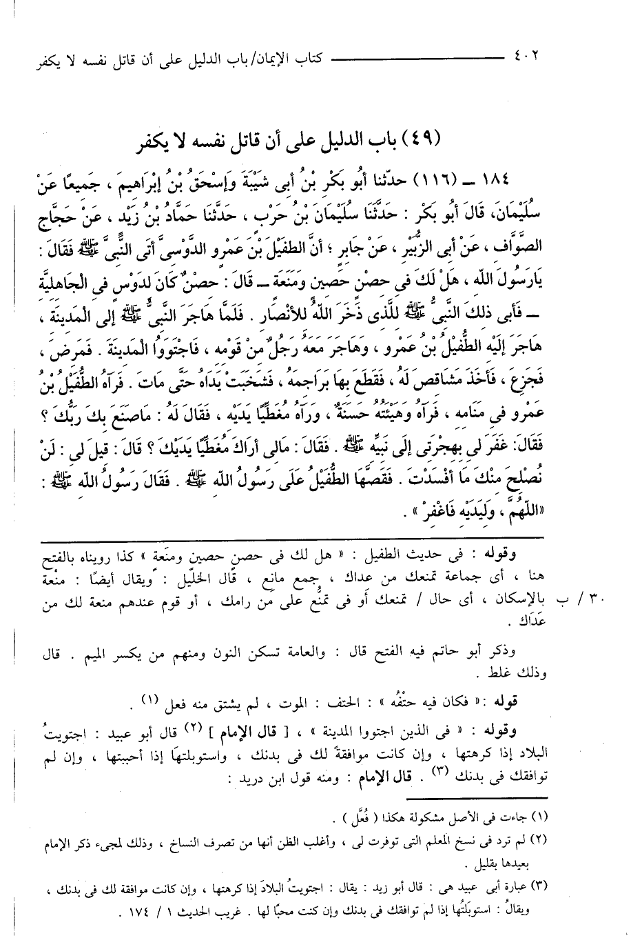 184 - (116) حدّثنا أَبُو بَكْرِ بْنُ أَبِى شَيْبَةَ وَإِسْحَاقُ بْنُ إبْرَاهِيمَ، جَمِيعًا عَنْ سُلَيْمَانَ، قَالَ أَبُو بَكْر: حَدَّثَنَا سُلَيْمَانَ بْنُ حَرْبٍ، حَدَّثَنَا حَمَّادُ بْنُ زَيْدٍ، عَنْ حَجَّاج الصَّوَّافِ، عَنْ أَبِى الزُّبَيْرِ، عَنْ جَابِرٍ؛ أَنَّ الطفَيْلَ بْنَ عَمْرٍو الدَّوْسِىَّ أتَى النَّبِىَّ صَلَّى اللهُ عَلَيْهِ وَسَلَّمَ فَقَالَ: يَا رَسُولَ اللهِ، هَلْ لَكَ فىِ حِصْنٍ حَصِينٍ وَمَنَعَةٍ - قَالَ: حِصْنٌ كَانَ لِدَوْسٍ فِى الْجَاهِلِيَّةِ - فَأبى ذلِكَ النَّبِىُّ صَلَّى اللهُ عَلَيْهِ وَسَلَّمَ لِلَّذِى ذَخَرَ اللهُ لِلأنْصَارِ. فَلَمَّا هَاجَرَ النَّبِىُّ صَلَّى اللهُ عَلَيْهِ وَسَلَّمَ إلى الْمَدِينَةِ، هَاجَرَ إلَيْهَ الطُّفيْلُ بْنُ عَمْرو، وَهَاجَرَ مَعَهُ رَجُلٌ مِنْ قَوْمِهِ، فَاجْتَوَوُا الْمَدِينَةَ. فَمَرِضَ، فَجَزِعَ، فَأَخَذَ مَشَاقِصَ لَهُ، فَقَطَعَ بِهَا بَرَاجِمَهُ، فَشَخَبَتْ يَدَاهُ حَتَّى مَاتَ. فَرَاهُ الطُّفَيْلُ بْنُ عَمْرو فىِ مَنَامِهِ، فَرَآهُ وَهَيْئَتُهُ حَسَنَةٌ، وَراَهُ مُغَطِّيًا يَدَيْهِ، فَقَالَ لَهُ: مَا صَنَعَ بِكَ رَبُّكَ؟ فَقَالَ: غَفَرَ لِى بَهِجْرَتِى إلَى نَبِيِّهِ صَلَّى اللهُ عَلَيْهِ وَسَلَّمَ. فَقَالَ: مَالِى أرَاكَ مُغَطِّيًا يَدَيْكَ؟ قَالَ: قِيلَ لِى: لَنْ نُصْلِحَ مِنْكَ مَا أفْسَدْتَ. فَقَصَّهَا الطُّفَيْلُ عَلَى رَسُولُ اللهِ صَلَّى اللهُ عَلَيْهِ وَسَلَّمَ. فَقَالَ رَسُولُ اللهِ صَلَّى اللهُ عَلَيْهِ وَسَلَّمَ: " اللهُمَّ، وَلِيَدَيْهِ فَاغْفِرْ ".