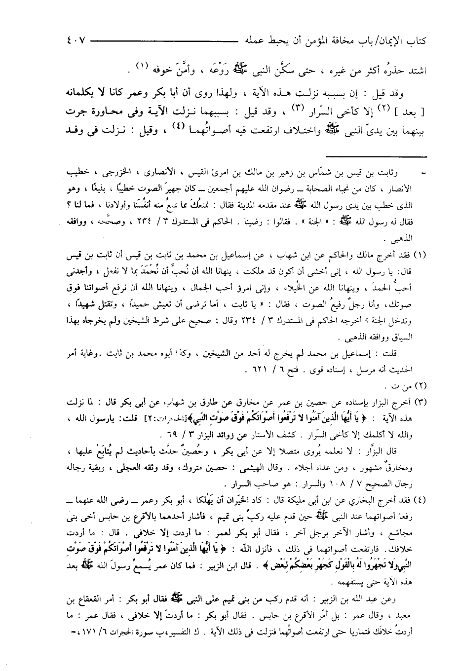 (¬4) فقد أخرج البخاري عن ابن أبى مليكة قال: كاد الخيّران أن يَهْلكا، أبو بكر وعمر - رضى الله عنهما - رفعا أصواتهما عند النبى صَلَّى اللهُ عَلَيْهِ وَسَلَّمَ حين قدم عليه ركبُ بنى تميم، فأشار أحدهما بالأقرع بن حابس أخى بنى مجاشع، وأشار الآخر برجل آخر، فقال أبو بكر لعمر: ما أردت إلا خلافى. قال: ما أردت خلافك. فارتفعت أصواتهما فى ذلك، فأنزل الله: {يَا أَيُّهَا الَّذِينَ آمَنُوا لا تَرْفَعُوا أَصْوَاتَكُمْ فَوْقَ صَوْتِ النَّبِيّ وَلا تَجْهَرُوا لَهُ بِالْقَوْلِ كَجَهْرِ بَعْضِكُمْ لِبَعْض}. قال ابن الزبير: فما كان عمر يُسمعُ رسولَ الله صَلَّى اللهُ عَلَيْهِ وَسَلَّمَ بعد هذه الآية حتى يستفهمه.