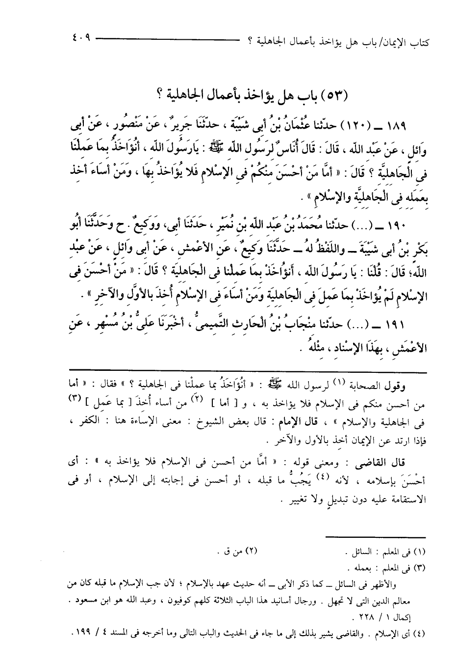 189 - (120) حدّثنا عُثْمَانُ بْنُ أَبِى شَيْبَة، حدّثَنَا جَرِيرٌ، عَنْ مَنْصُورٍ، عَنْ أَبِى وَائِلٍ، عَنْ عَبْدِ اللهِ، قَالَ: قَالَ أُنَاسٌ لِرَسُولِ اللهِ صَلَّى اللهُ عَلَيْهِ وَسَلَّمَ: يَا رَسُولَ اللهِ، أنُؤَاخَذُ بِمَا عَمِلْنَا فىِ الْجَاهِلِيَّة؟ قَالَ: " أمَّا مَنْ أحْسَنَ مِنْكُمْ فِى الإِسْلامِ فَلا يُؤَاخذُ بِهَا، وَمَنْ أَسَاءَ أخِذ بِعَمَلِهِ فِى الْجَاهِلِيَّةِ والإسْلامِ ".