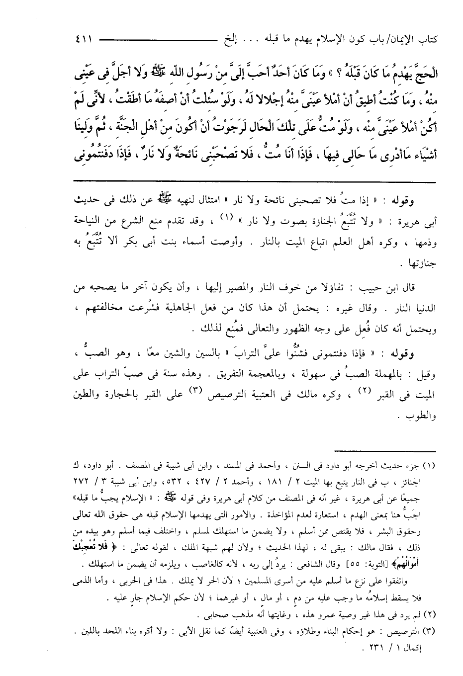 (¬1) جزء حديث أخرجه أبو داود فى السنن، وأحمد فى المسند، وابن أبى شيبة فى المصنف. أبو داود، ك الجنائز، ب فى النار يتبع بها الميت 2/ 181، وأحمد 2/ 427، 532، وابن أبى شيبة 3/ 272 جميعًا عن أبى هريرة، غير أنه فى المصنف من كلام أبى هريرة وفى قوله صَلَّى اللهُ عَلَيْهِ وَسَلَّمَ: " الإسلام يجبُّ ما قبله " الجَبُّ هنا بمعنى الهدم، استعارة لعدم المؤاخذة. والأمور التى يهدمها الإسلام قبله هى حقوق الله تعالى وحقوق البشر، فلا يقتص ممن أسلم، ولا يضمن ما استهلك لمسلم، واختلف فيما أسلم وهو بيده من ذلك، فقال مالك: يبقى له، لهذا الحديث؛ ولأن لهم شبهة الملك، لقوله تعالى: {فَلا تُعْجِبْكَ أَمْوَالُهُمْ} [التوبة: 55] وقال الشافعى: يردُ إلى ربه، لأنه كالغاصب، ويلزمه أن يضمن ما استهلك.