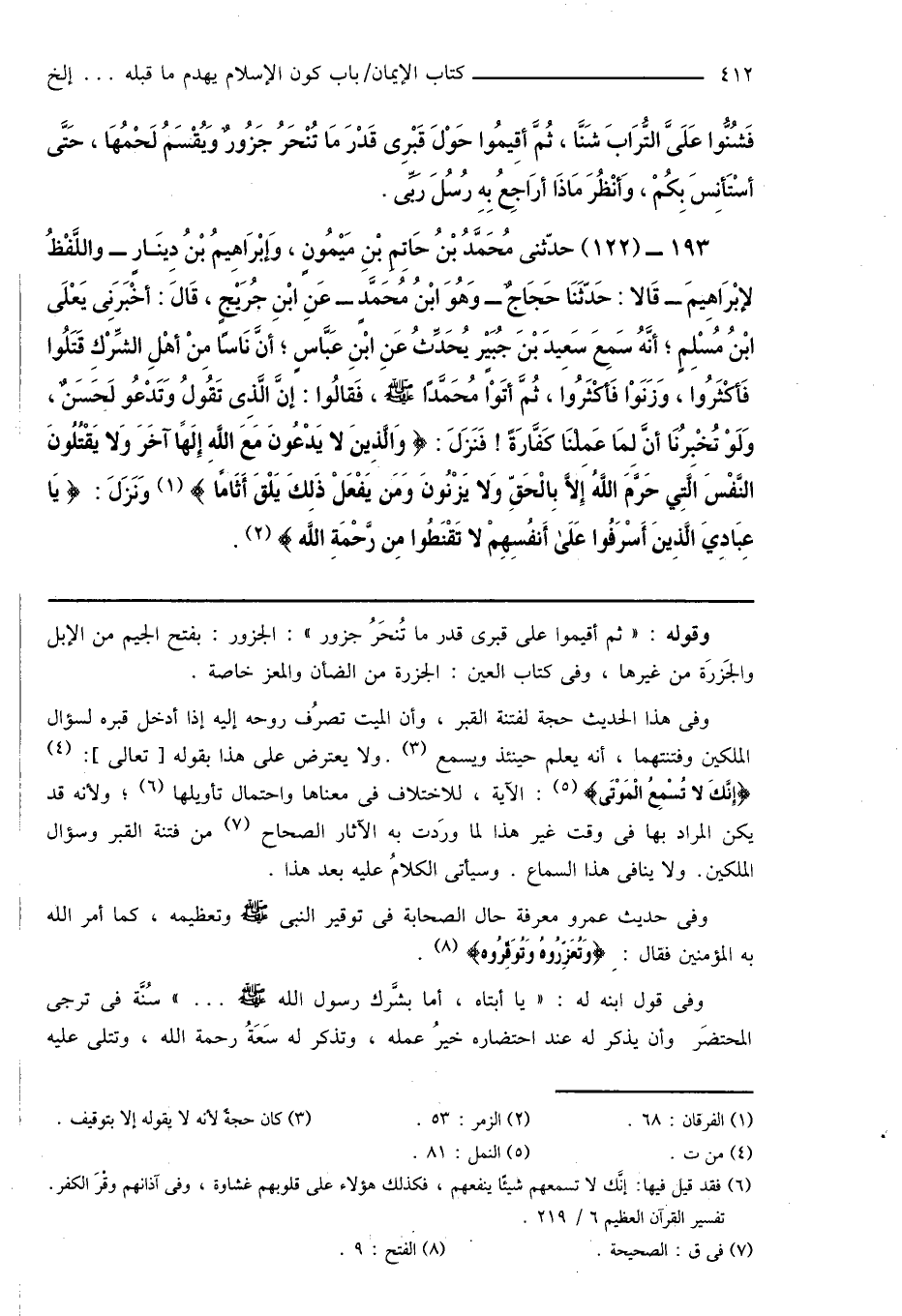 193 - (122) حدّثنى مُحَمَّدُ بْنُ حَاتِمِ بْنِ مَيْمُونٍ، وَإبْرَاهِيمُ بْنُ دِينَارٍ - واللَّفْظُ لإبْرَاهِيمَ - قَالا: حَدَّثَنَا حَجَّاجٌ - وَهُوَ ابْنُ مُحَمَّدٍ - عَنِ ابْنِ جُرَيْجٍ، قَالَ: أَخْبَرَنِى يَعْلَى ابْنُ مُسْلِمٍ؛ أَنَّهُ سَمِعَ سَعِيدَ بْنَ جُبَيرٍ يُحَدِّثُ عَنِ ابْنِ عَبَّاسٍ؛ أَنَّ نَاسًا مِنْ أَهْلِ الشِّرْكِ قَتَلُوا فَأكْثَرُوا، وَزَنَوْا فَأكْثَرُوا، ثُمَّ أَتَوْا مُحَمَّدًا صَلَّى اللهُ عَلَيْهِ وَسَلَّمَ، فَقالُوا: إِنَّ الَّذِى تَقُولُ وَتَدْعُو لَحَسَنٌ، وَلَوْ تُخْبِرُنَا أَنَّ لِمَا عَمِلْنَا كَفَّارَةً! فَنَزَلَ: {وَالَّذِينَ لا يَدْعُونَ مَعَ اللَّهِ إِلَهًا آخَرَ وَلا يَقْتُلُونَ النَّفْسَ الَتِي حَرَّمَ اللَّهُ إِلَّا بِالْحَقِّ وَلا يَزْنُونَ وَمَن يَفْعَلْ ذَلِكَ يَلْقَ أَثَامًا} (¬1) وَنَزَلَ: {يَا عِبَادِيَ الَّذِينَ أَسْرَفُوا عَلَى أَنفُسِهِمْ لا تَقْنَطُوا مِن رَّحْمَةِ اللَّه} (¬2).