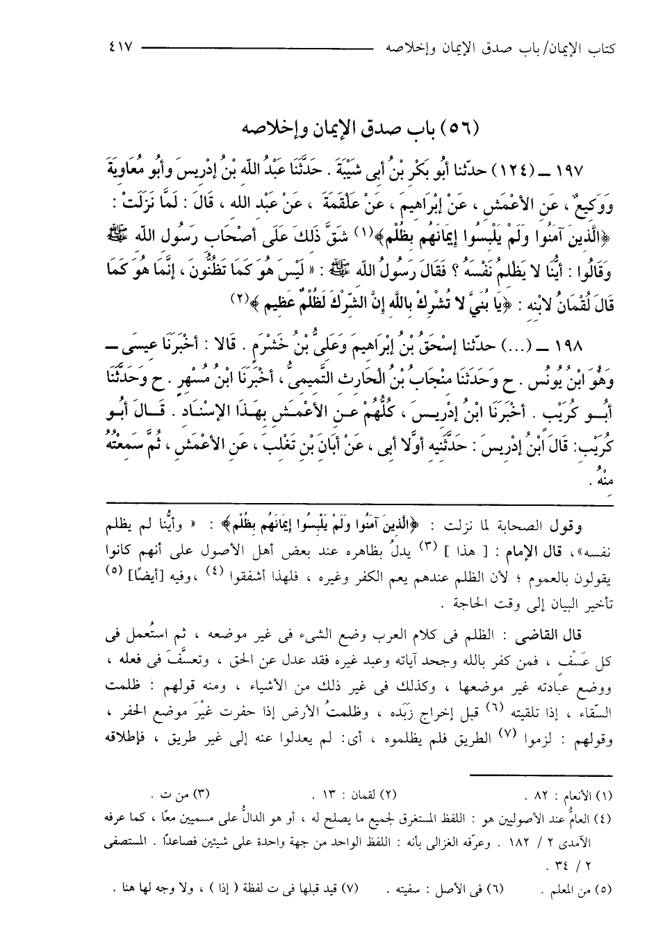 197 - (124) حدّثنا أَبُو بَكْرِ بْنُ أَبِى شَيْبَةَ. حَدَّثَنَا عَبْدُ اللهِ بْنُ إدْرِيسَ وأبُو مُعَاوِيَةَ وَوَكِيعٌ، عَنِ الأَعْمَشِ، عَنْ إِبْرَاهِيمَ، عَنْ عَلْقَمَةَ، عَنْ عَبْدِ اللهِ، قَالَ: لَمَّا نَزَلَتْ: {الَّذِينَ آمَنُوا وَلَمْ يَلْبِسُوا إِيمَانَهُمَ بِظُلْم} (¬1) شَقَّ ذَلِكَ عَلَىَ أصْحَابِ رَسُولِ اللهِ صَلَّى اللهُ عَلَيْهِ وَسَلَّمَ وَقَالُوا: أيُّنَا لا يَظْلِمُ نَفْسَهُ؟ فَقَالَ رَسُولُ اللهِ صَلَّى اللهُ عَلَيْهِ وَسَلَّمَ: " لَيْسَ هُوَ كَمَا تَظُنُّونَ، إنَّمَا هُوَ كَمَا قَالَ لُقْمَانُ لابْنِهِ: {يَا بُنَيَّ لا تُشْرِكْ بِاللَّهِ إِنَّ الشَّرْكَ لَظُلْمٌ عَظِيم} (¬2)