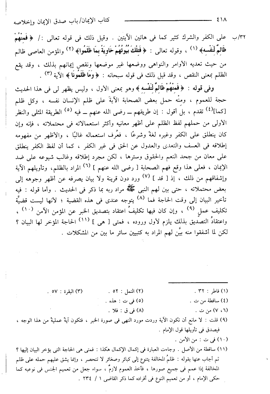 وهى قوله: {فَمِنْهُمْ ظَالِمٌ لِّنَفْسِهِ} وهو بمعنى الأول، وليس يظهر لى فى هذا الحديث حجة للعموم، ومِنْه حمل بعض الصحابة الآيةَ على ظلم الإنسان نفسه، وكل ظلم [كما] (¬4) تقدم، بل أقول: إن طريقهم - رضى الله عنهم - فيه (¬5) الطريقة المثلى والنظر الأولى من حملهم لفظ الظلم على أظهر معانيه وأكثر استعمالاته فى محتملاته، فإنه وإن كان ينطلق على الكفر وغيره لغةً وشرعًا، فعُرف استعماله غالبًا، والأظهر من مفهومه إطلاقه فى العسف والتعدى والعدول عن الحق فى غير الكفر، كما أن لفظ الكفر ينطلق على معان من جحد النعم والحقوق وسترها، لكن مجرد إطلاقه وغالب شيوعه على ضد الإيمان، فعلى هذا وقع فهم الصحابة [رضى الله عنهم] (¬6) المراد بالظلم، وتأويلهم الآية وإشفاقهم من ذلك، إذ [قد] (¬7) ورد دون قرينة ولا بيان يصرفه عن أظهر وجوهه إلى بعض محتملاته، حتى بين لهم النبى صَلَّى اللهُ عَلَيْهِ وَسَلَّمَ مراد ربه بما ذكر فى الحديث. وأما قوله: فيه تأخير البيان إلى وقت الحاجة فما (¬8) يتوجه عندى فى هذه القضية؛ لأنها ليست قضيَّة تكليف عملٍ (¬9)، وإن كان فيها تكليفُ اعتقاد بتصديق الخبر عن المؤمن الآمن (¬10)، واعتقادُ التصديق بذلك يلزم لأول وروده، فمتى [هى] (¬11) الحاجة المؤخر لها البيان؟ لكن لما أشفقوا منه بيَّن لهم المراد به كتبيين سائر ما بين من المشكلات.