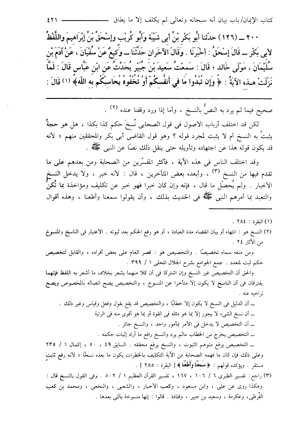200 - (126) حدّثنا أَبُو بَكْرِ بْنُ أَبِى شَيْبَة وَأَبُو كُريْبٍ وإسْحَاقُ بْنُ إبْرَاهِيمَ واللَّفْظُ لأبِى بَكْر - قَالَ إسْحَاقُ: أَخْبَرَنَا. وَقَالَ الآخَرانِ حَدَّثَنَا - وَكِيعٌ عَنْ سُفْيَانَ، عَنْ آدَمَ بْنِ سُلَيْمَانَ، مَوْلَى خَالِدٍ؛ قَالَ: سَمِعْتُ سَعِيدَ بْنَ جُبَيْرٍ يُحَدِّثُ عَنِ ابْنِ عَبَّاسٍ قَالَ: لَمَّا نَزَلَتْ هذِهِ الآيَةُ: {وَإِن تُبْدُوا مَا فِي أَنفُسِكُمْ أَوْ تُخْفُوهُ يُحَاسِبْكُم بِهِ اللَّه} (¬1) قَالَ: