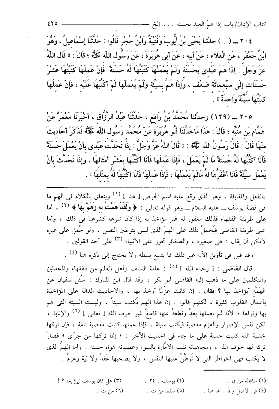 204 - (...) حدّثنا يَحْيَى بْنُ أَيُّوبَ وَقُتَيْبَةُ وَابْنُ حُجْرٍ قَالُوا: حَدَّثَنَا إِسْمَاعِيلُ، وَهوَ ابْنُ جَعْفَرٍ، عَنِ الْعَلاءِ، عَنْ أبِيهِ، عَنْ أَبِى هُرَيْرَةَ، عَنْ رَسُولِ اللهِ صَلَّى اللهُ عَلَيْهِ وَسَلَّمَ؛ قَالَ: " قَال اللهُ عَزَّ وَجَلَّ: إِذَا هَمَّ عَبْدِى بِحَسَنَةٍ وَلَمْ يَعْمَلهَا كَتَبْتُهَا لَهُ حَسَنةً فَإِنْ عَمِلَهَا كَتَبْتُهَا عَشْرَ حَسَنَاتٍ إلَى سَبْعِمِائَةٍ ضِعْفٍ، وَإِذَا هَمَّ بِسَيِّئَةٍ وَلَمْ يَعْمَلْهَا لَمْ اُكْتُبْهَا عَلَيْهِ، فَإِنْ عَمِلَهَا كَتَبْتُهَا سَيِّئَةً وَاحِدَةً ".