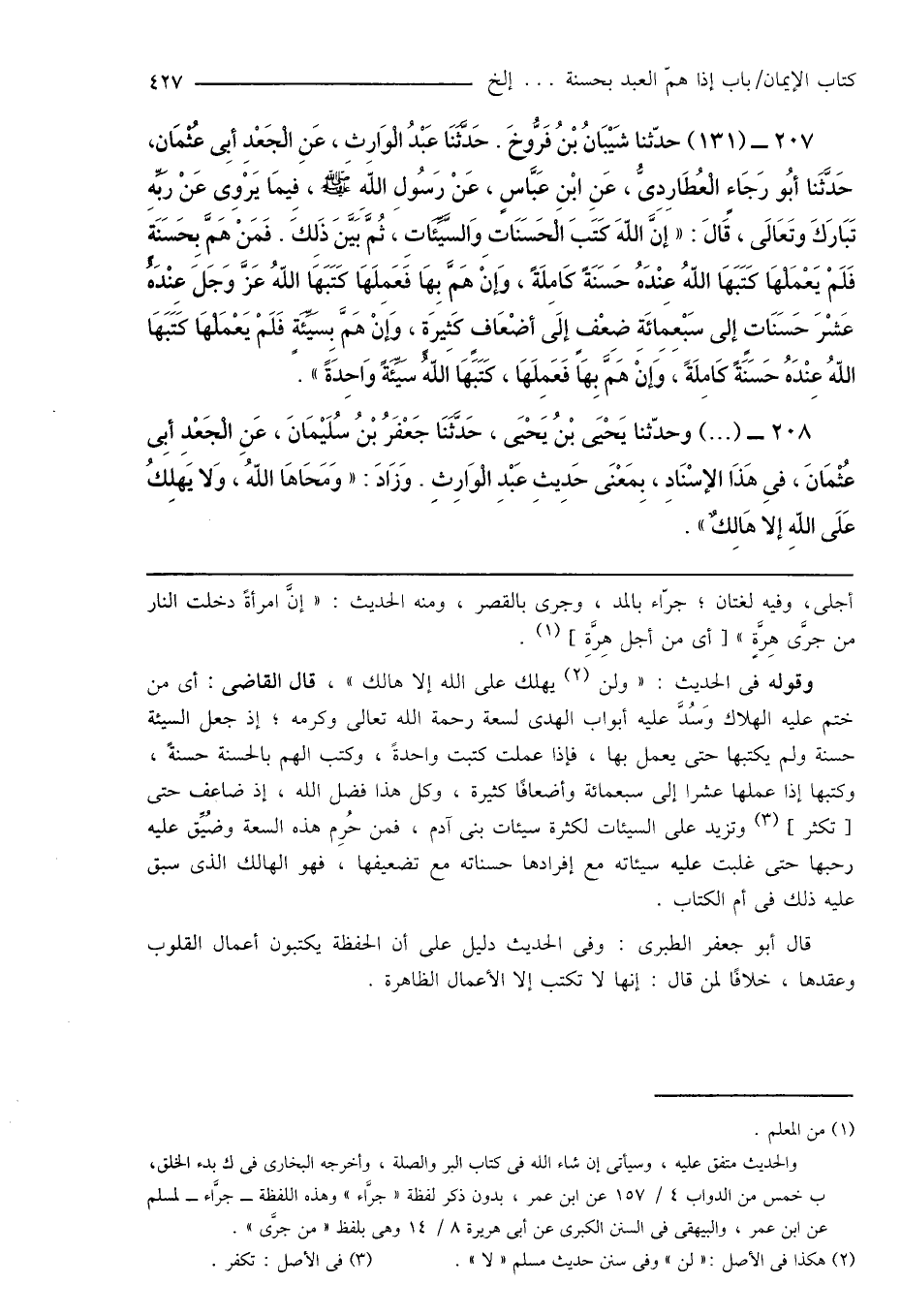207 - (131) حدّثنا شَيْبَانُ بْنُ فَرُّوخَ. حَدَّثَنَا عَبْدُ الْوَارِثِ، عَنِ الْجَعْدِ أَبِى عُثْمَان، حَدَّثَنَا أَبُو رَجَاءٍ الْعُطَارِدِىُّ، عَنِ ابْنِ عَبَّاسٍ، عَنْ رَسُولِ اللهِ صَلَّى اللهُ عَلَيْهِ وَسَلَّمَ، فِيمَا يَرْوِى عَنْ رَبِّهِ تَبَارَكَ وتَعَالَى، قَالَ: " إِنَّ اللهَ كَتَبَ الْحَسَنَاتِ وَالسَّيِّئَاتِ، ثُمَّ بَيَّنَ ذَلِكَ. فَمَنْ هَمَّ بِحَسَنَةٍ فَلَمْ يَعْمَلْهَا كَتَبَهَا اللهُ عِنْدَهُ حَسَنَةً كَامِلَةً، وَإِنْ هَمَّ بِهَا فَعَمِلَهَا كَتَبَهَا اللهُ عَزَّ وَجَلَّ عِنْدَهُ عَشْرَ حَسَنَاتٍ إلى سَبْعِمِائَةِ ضِعْفٍ إلَى أضْعَافٍ كَثِيرَةٍ، وَإِنْ هَمَّ بِسَيِّئَةٍ فَلَمْ يَعْمَلْهَا كَتَبَهَا اللهُ عِنْدَهُ حَسَنَةً كَامِلَةً، وَإِنْ هَمَّ بِهَا فَعَمِلَهَا، كَتَبَهَا اللهُ سَيِّئَةً وَاحِدَةً ".