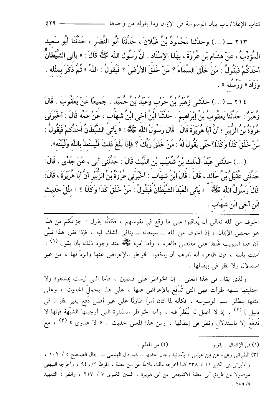 214 - (...) حدّثنى زُهَيْرُ بْنُ حَرْبٍ وَعَبْدُ بْنُ حُمَيْدٍ. جَمِيعًا عَنْ يَعْقُوبَ. قَالَ زُهَيْرٌ: حَدَّثَنَا يَعْقُوبُ بْنُ إِبْرَاهِيمَ. حَدَّثَنَا ابنُ أخِى ابْنُ شِهَابٍ، عَنْ عَمِّهِ قَالَ: أَخْبَرَنِى عُرْوَةُ بْنُ الزُّبَيْرِ؛ أَنَّ أَبَا هُرَيْرَةَ قَالَ: قَالَ رَسُولُ اللهِ صَلَّى اللهُ عَلَيْهِ وَسَلَّمَ: " يَأتِى الشَّيْطَانُ أحَدُكمْ فَيَقُولُ: مَنْ خَلَقَ كَذَا وَكَذَا؟ حَتّى يَقُولَ لَهُ: مَنْ خَلَقَ رَبَّكَ؟ فَإِذَا بَلَغَ ذلِكَ فَلْيَسْتَعِذْ بِاللهِ وَلْيَنْتَهِ ".